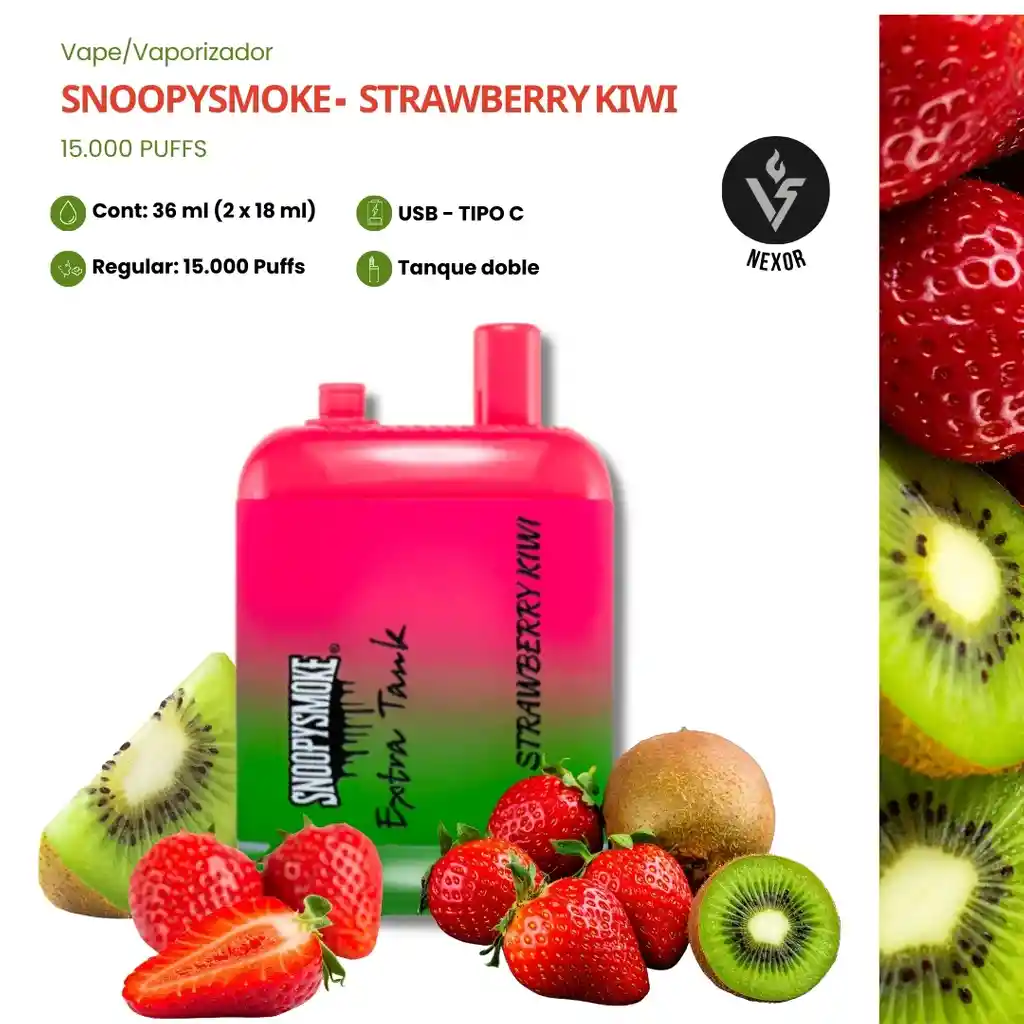 Un clásico irresistible: fresa madura con un kiwi fresco y ligeramente ácido. 🍓🥝 El Snoopy Smoke 15K con doble tanque te permite continuar vapeando sin interrupciones cuando uno se vacía. Con 36 ml de e-líquido, 50 mg, 650 mAh USB-C y +15.000 puffs, ofrece un vapor aromático, suave y estable. Ideal para quienes aman sabores frutales limpios y equilibrados.