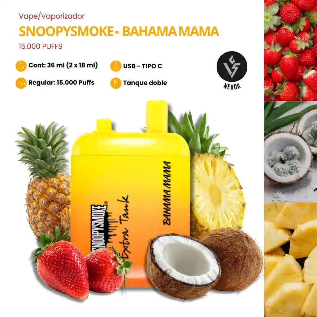 Un sabor tropical inspirado en el famoso cóctel caribeño. Combina piña dulce, fresa y un toque suave de coco para una experiencia exótica y refrescante en cada calada. El Snoopy Smoke 15K Extra Tank te ofrece dos tanques independientes, duplicando la vida útil del vaporizador.