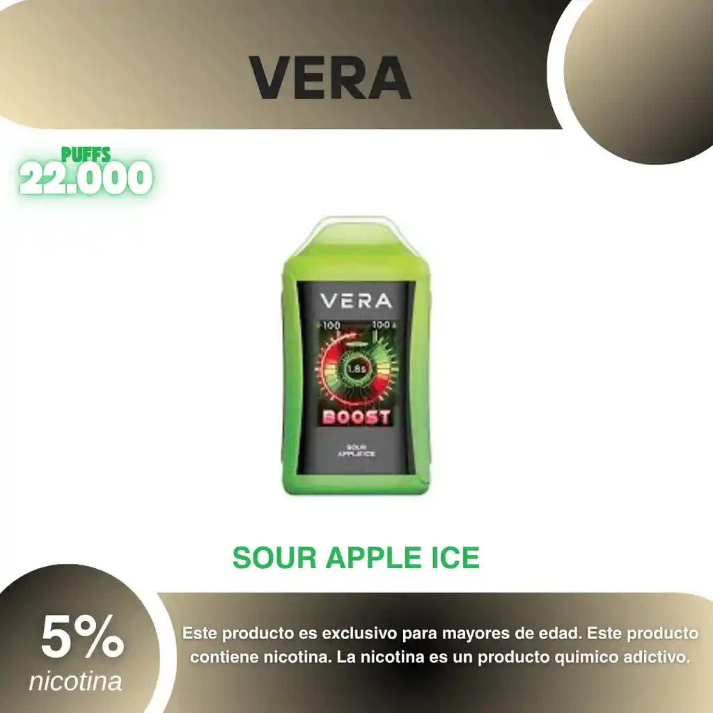 Vape Vera Vr 22.000 Puffs Sabor Manzana Verde 5% PROHIBIDA LA VENTA A MENORES DE EDAD. ADVERTENCIA: ESTE PRODUCTO CONTIENE NICOTINA, LA NICOTINA ES UNA SUSTANCIA QUIMICA ADICTIVA Y NOCIVA PARA LA SALUD. Los líquidos para vapeo contienen: propilenglicol USP, glicerina USP, sabor artificial y nicotina. Este producto puede contener nicotina, una sustancia altamente adictiva que puede generar dependencia, posibles afectaciones arteriales, cardiacas, pulmonares y otras aun no identificadas. No se recomienda su uso a mujeres en embarazo, puede generar lesiones al feto. Mantener alejado de niños y mascotas. No ingerir, puede generar irritación y/o intoxicación. Por favor antes de consumir consulte a su médico posibles afectaciones o sensibilidad a alguno de sus componentes. Los componentes de este producto pueden aumentar la sensación de ansiedad En caso de notar alguna reacción adversa por favor suspenda su uso de manera inmediata. Siga las instrucciones en el envase. No alterar sus componentes. Adquiera sus productos en sitios de confianza No use productos piratas, alterados, o en los cuales no pueda comprobar su buena procedencia, Verifique la reputación del fabricante y distribuidor antes de adquirir cualquier producto Si no es usuario fumador o vapeador no se recomienda su uso bajo ninguna circunstancia Al usar este producto usted es consciente que este producto puede generar afectaciones a su salud, incluyendo aquellas que a la fecha de la compra no se han identificado y que pueden aparecer a largo plazo