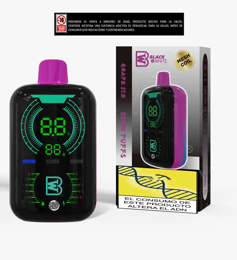 Descubre el equilibrio perfecto entre estilo y tecnología con nuestro vapeador Black White de 28.000 puffs. Su pantalla dinámica te mantiene al tanto de la batería y la esencia restante, para que disfrutes sin interrupciones. ⚫⚪ Diseño sofisticado ⚡ Duración extrema 📊 Control total en pantalla Haz de cada inhalación una experiencia sin límites. Este producto contiene nicotina de 5 %, es una sustancia adictiva. Prohibida su venta a menores de edad, es perjudicial para la salud, antes de consumir leer indicaciones y contraindicaciones