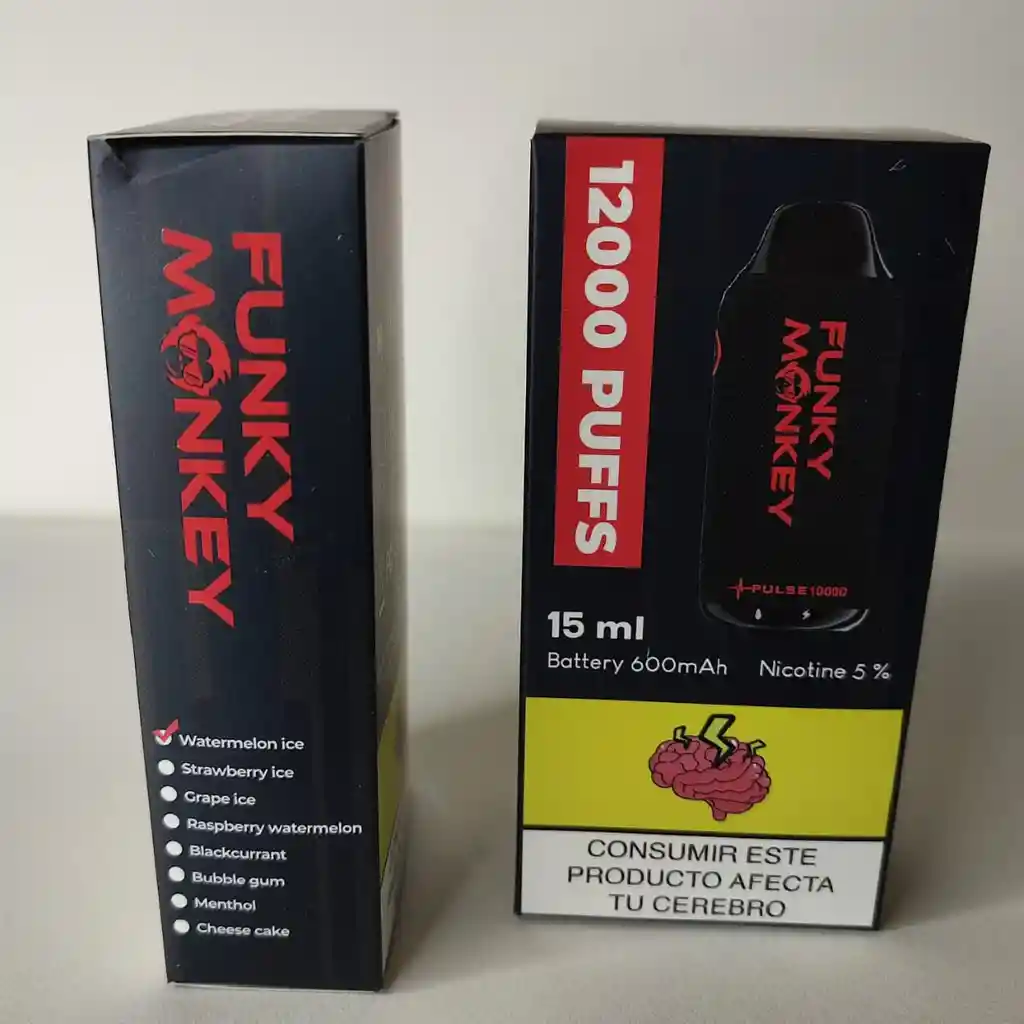 Especificaciones Técnicas Funky Monkey Pulse Rendimiento Superior: Hasta 12.000 Puffs (caladas) de sabor intenso y constante. Tecnología de Potencia Variable: Incluye un botón dinámico que permite alternar la potencia para una calada personalizada. Monitoreo Inteligente: Equipado con dos indicadores LED independientes que muestran el nivel de batería y el nivel de esencia (e-liquid) en tiempo real. Sistema de Resistencia: Dual Mesh Coil (Doble Malla) diseñada para maximizar el sabor y evitar el gusto a quemado. Batería de Alta Eficiencia: Capacidad de 650mAh, optimizada para durar todo el día. Carga Rápida: Puerto USB Tipo-C (el estándar más moderno y rápido). Concentración de Nicotina: 5% (50mg), ideal para una satisfacción inmediata. El watermelon ice es una mezcla popular en vapeadores y líquidos que combina la dulzura intensa y jugosa de la sandía madura con una fuerte sensación mentolada o "hielo". Ofrece una experiencia frutal, refrescante y revitalizante.