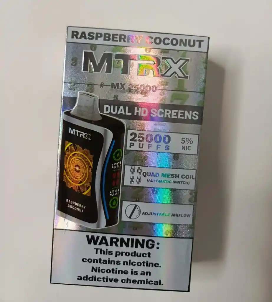 Descubre el vaporizador desechable MTRX MX25000, que revoluciona el vapeo con su capacidad de 25 000 caladas y sus innovadoras funciones. Con un diseño elegante y un depósito de e-líquido de 20 ml, ofrece potentes dosis de nicotina tanto para exfumadores como para vapeadores experimentados. Disfruta de la rápida carga tipo C y de una batería de 900 mAh de larga duración. Su sistema de resistencia de malla cuádruple garantiza una producción de vapor constante y un sabor excepcional. Las dos pantallas HD ofrecen atractivas animaciones y estadísticas en tiempo real, mientras que el flujo de aire ajustable adapta cada calada a tus preferencias. Disfruta de la comodidad, la durabilidad y la personalización con el MTRX MX25000. Características principales E-líquido precargado de 20 ml Concentración de nicotina del 5 % (50 mg) Batería recargable tipo C de 900 mAh Aproximadamente 25.000 bocanadas Bobina de malla cuádruple Cambia automáticamente las bobinas duales cada 10 segundos Pantalla dual HD 3 animaciones únicas de vapeo La pantalla del panel lateral muestra el porcentaje de batería y e-líquido Flujo de aire ajustable El Raspberry Coconut presenta un inconfundible sabor a mermelada de frambuesa y virutas de coco rayado.