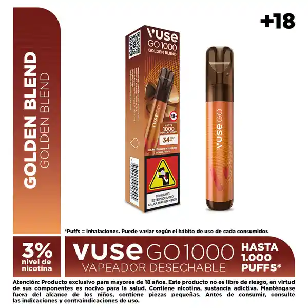 Atención: Producto exclusivo para mayores de 18 años Este producto no es libre de riesgo, en virtud de sus componentes es nocivo para la salud. Contiene nicotina, sustancia adictiva. Manténgase fuera del alcance de los niños, contiene piezas pequeñas. Antes de consumir, consulte las indicaciones y contraindicaciones de uso. Desde el 21 de julio de 2025 productores e importadores estarán obligados a comercializar sus productos con los pictogramas y advertencias sanitarias establecidas por el Ministerio de Salud. Por lo anterior, coexistirán en los puntos de venta y/o entregas a domicilio empaques de producto con o sin advertencia sanitaria, hasta que estos últimos sean comercializados en su totalidad. La presente comunicación se publica en cumplimiento de lo dispuesto en los artículos 3 (numeral 1.3) y 23 a 28 del Estatuto del Consumidor (Ley 1480 de 2011), suministra información clara, suficiente, veraz y oportuna. El contenido aquí publicado no tiene fines promocionales ni publicitarios.Ingredientes: propilenglicol, glicerina vegetal, saborizante artificial de tabaco, nicotina (sustancia adictiva y nociva para la salud), ácido benzoico, ácido láctico, agua, alcohol bencílico, furaneol y piperonal. Empaque con 1 dispositivo de Vuse GO 1000. Cont. Net. de líquido vaporizable: 2 ml. Contenido de nicotina por dispositivo: 68 mg. Intensidad total de nicotina (administración de dosis): 34 mg/ml, equivalente al 3% del contenido neto del dispositivo.