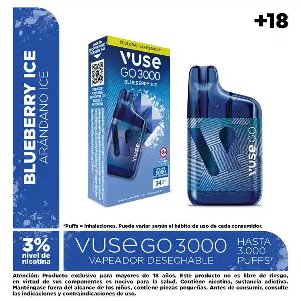 Atención: Producto exclusivo para mayores de 18 años Este producto no es libre de riesgo, en virtud de sus componentes es nocivo para la salud. Contiene nicotina, sustancia adictiva. Manténgase fuera del alcance de los niños, contiene piezas pequeñas. Antes de consumir, consulte las indicaciones y contraindicaciones de uso. Desde el 21 de julio de 2025 productores e importadores estarán obligados a comercializar sus productos con los pictogramas y advertencias sanitarias establecidas por el Ministerio de Salud. Por lo anterior, coexistirán en los puntos de venta y/o entregas a domicilio empaques de producto con o sin advertencia sanitaria, hasta que estos últimos sean comercializados en su totalidad. La presente comunicación se publica en cumplimiento de lo dispuesto en los artículos 3 (numeral 1.3) y 23 a 28 del Estatuto del Consumidor (Ley 1480 de 2011), suministra información clara, suficiente, veraz y oportuna. El contenido aquí publicado no tiene fines promocionales ni publicitarios.Ingredientes: propilenglicol, glicerina vegetal, saborizante artificial de mora azul, nicotina, ácido benzoico, ácido láctico, agua, alcohol bencílico, furaneol. piperonal y damascenona (beta-). Empaque con 1 dispositivo de Vuse GO 3000. Cont. Net. de líquido vaporizable: 8 ml. Contenido de nicotina: 272 mg. Intensidad total de nicotina (administración de dosis): 34 mg/ml, equivalente al 3% del contenido neto del dispositivo.