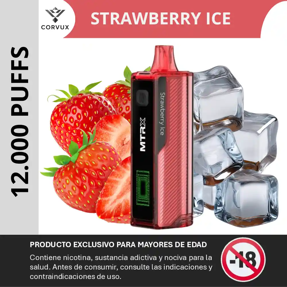 PROHIBIDA LA VENTA A MENORES DE EDAD. PRODUCTO EXCLUSIVO PARA MAYORES DE EDAD, CONTIENE NICOTINA, SUSTANCIA ADICTIVA Y NOCIVA PARA LA SALUD. ANTES DE CONSUMIR, CONSULTE LAS INDICACIONES Y CONTRAINDICACIONES DE USO. El MTRX 12000 Puffs Strawberry Ice es un dispositivo de vapeo desechable de alto rendimiento, diseñado para brindar hasta 12 000 caladas aproximadamente en un formato cómodo y fácil de usar. Pertenece a la familia MTRX 12K, que integra funciones modernas como pantalla digital con indicadores, modos ajustables y flujo de aire personalizable para una experiencia prolongada. ✨ Perfil del sabor ✦ Notas Principales: Sabor dulce y jugoso de fresas maduras, con carácter frutal clásico de esta baya. ✦ Contrastes: El dulzor natural de la fresa se combina con un toque fresco tipo mentol/“ice”, aportando un contraste refrescante y vivaz. ✦ Experiencia Sensorial: Cada calada ofrece una sensación definida de fresa seguida de un acabado frío ligero, equilibrando lo dulce con una frescura sutil. ✦ Ideal para: Adultos que prefieren sabores frutales clásicos con una nota fresca, en un formato duradero y fácil de usar. 📋 Especificaciones técnicas ✦ Capacidad de caladas: Hasta 12 000 puffs con una sola carga. ✦ E-líquido precargado: ~15 ml. ✦ Concentración de nicotina: 5 % (50 mg). ✦ Batería: ~650 mAh recargable mediante puerto USB-C. ✦ Pantalla: HD con indicadores de batería, nivel de e-líquido y modo. ✦ Modos de vapeo: Regular y Boost para variar intensidad. ✦ Flujo de aire: Ajustable para personalizar la resistencia de la calada. PROHIBIDA LA VENTA A MENORES DE EDAD. PRODUCTO EXCLUSIVO PARA MAYORES DE EDAD, CONTIENE NICOTINA, SUSTANCIA ADICTIVA Y NOCIVA PARA LA SALUD. ANTES DE CONSUMIR, CONSULTE LAS INDICACIONES Y CONTRAINDICACIONES DE USO.
