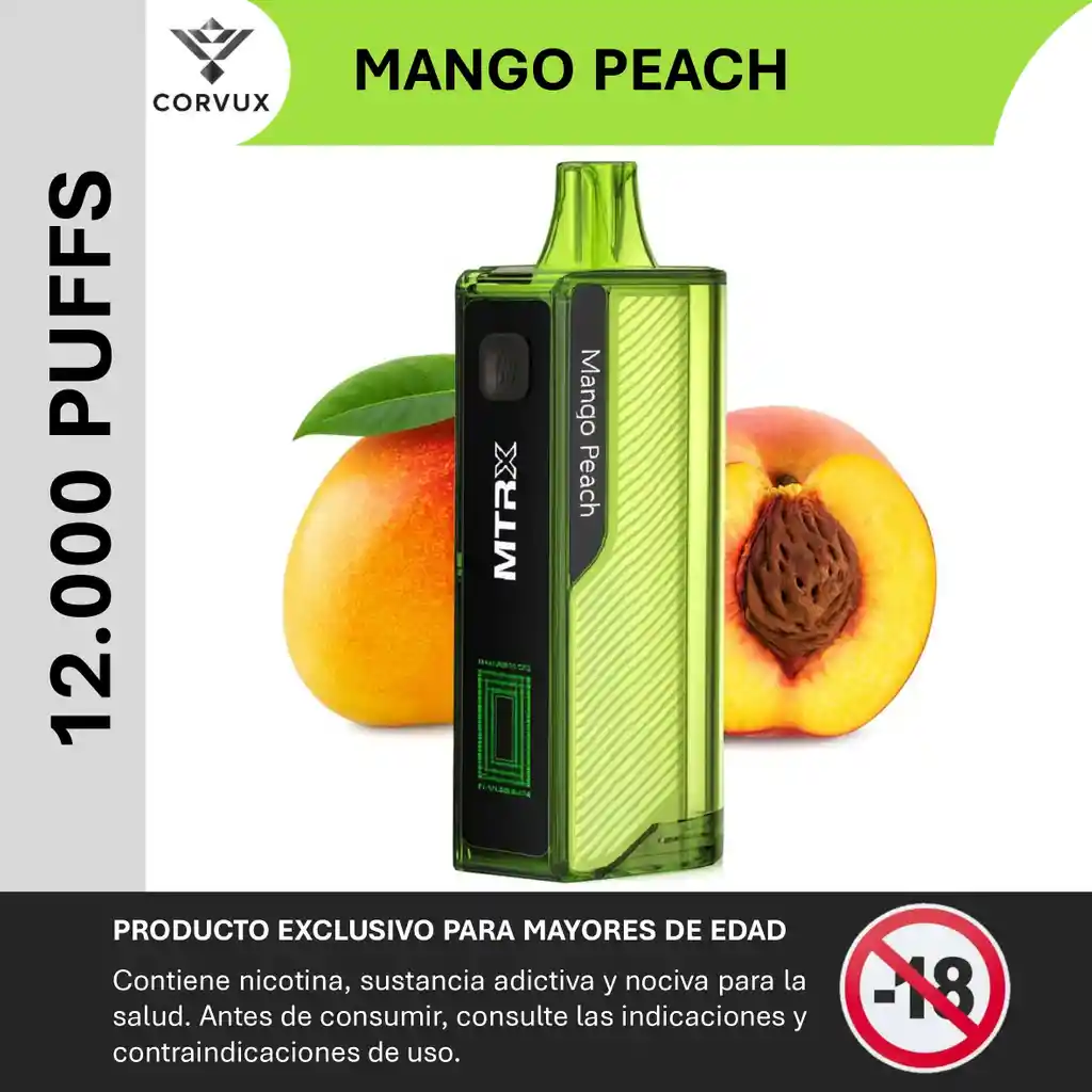 PROHIBIDA LA VENTA A MENORES DE EDAD. PRODUCTO EXCLUSIVO PARA MAYORES DE EDAD, CONTIENE NICOTINA, SUSTANCIA ADICTIVA Y NOCIVA PARA LA SALUD. ANTES DE CONSUMIR, CONSULTE LAS INDICACIONES Y CONTRAINDICACIONES DE USO. Vape Mtrx - Mango Peach - E-líquido precargado de 15 ml - Concentración de nicotina del 5 % (50 mg) - Batería recargable tipo C de 650 mAh - Dos modos de vapeo, diferentes cantidades de caladas - Modo regular: aproximadamente 12.000 bocanadas - Modo Boost: aproximadamente 6000 inhalaciones - Pantalla de visualización de animación HD - Indicador de batería, pantalla de modo e indicador de e-líquido - Flujo de aire ajustable - Interruptor de un clic: bobina de malla simple o doble - Flujo de aire ajustable