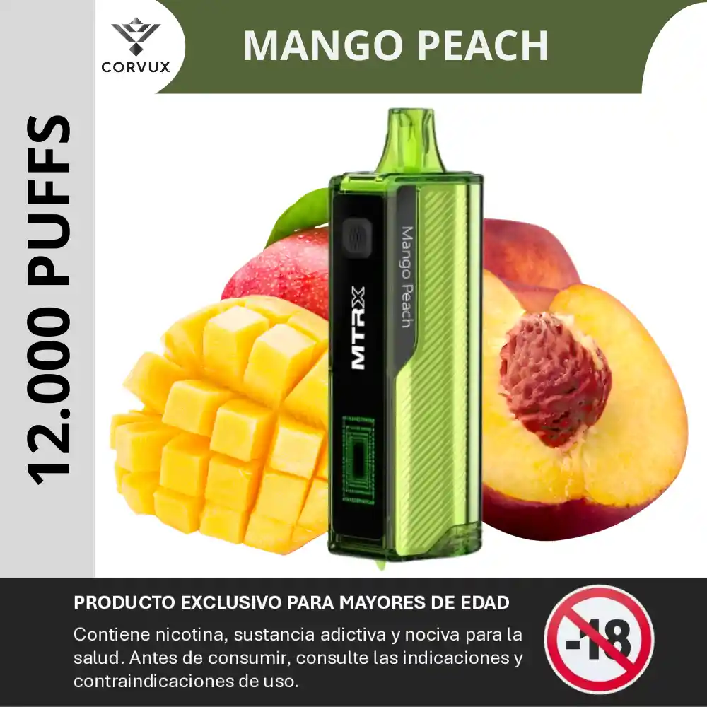 PROHIBIDA LA VENTA A MENORES DE EDAD. PRODUCTO EXCLUSIVO PARA MAYORES DE EDAD, CONTIENE NICOTINA, SUSTANCIA ADICTIVA Y NOCIVA PARA LA SALUD. ANTES DE CONSUMIR, CONSULTE LAS INDICACIONES Y CONTRAINDICACIONES DE USO. El MTRX 12000 Puffs Mango Peach es un dispositivo de vapeo desechable recargable con batería USB-C y pantalla digital con indicadores de batería, nivel de e-líquido y modo de uso. Está diseñado para ofrecer hasta 12 000 caladas en un formato compacto y de fácil uso. Su sabor combina mango tropical con durazno jugoso para un perfil frutal dulce y aromático. ✨ Perfil del sabor ✦ Notas Principales: Sabor definido de mango maduro complementado con matices de durazno dulce y fragante, creando un perfil frutal tropical. ✦ Contrastes: La dulzura del mango se equilibra con la suavidad melosa del durazno, aportando profundidad y balance sin ser empalagoso. ✦ Experiencia Sensorial: Cada calada ofrece una sensación frutal intensa y jugosa con tono suave y redondo, evocando sensaciones de fruta fresca madura. ✦ Ideal para: Adultos que prefieren sabores frutales tropicales con carácter dulce y aromático en un formato práctico y de larga duración. 📋 Especificaciones técnicas ✦ Capacidad de caladas: Hasta 12 000 puffs con una sola carga. ✦ E-líquido precargado: ~15 ml. ✦ Concentración de nicotina: 5 % (50 mg). ✦ Batería: ~650 mAh recargable mediante puerto USB-C. ✦ Pantalla: HD con indicadores de batería, nivel de e-líquido y modo. ✦ Modos de vapeo: Regular y Boost para variar intensidad. ✦ Flujo de aire: Ajustable para personalizar la resistencia de la calada. PROHIBIDA LA VENTA A MENORES DE EDAD. PRODUCTO EXCLUSIVO PARA MAYORES DE EDAD, CONTIENE NICOTINA, SUSTANCIA ADICTIVA Y NOCIVA PARA LA SALUD. ANTES DE CONSUMIR, CONSULTE LAS INDICACIONES Y CONTRAINDICACIONES DE USO.