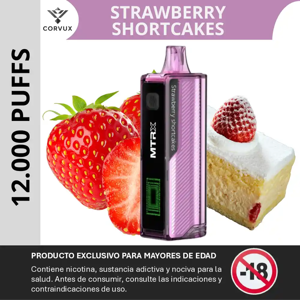PROHIBIDA LA VENTA A MENORES DE EDAD. PRODUCTO EXCLUSIVO PARA MAYORES DE EDAD, CONTIENE NICOTINA, SUSTANCIA ADICTIVA Y NOCIVA PARA LA SALUD. ANTES DE CONSUMIR, CONSULTE LAS INDICACIONES Y CONTRAINDICACIONES DE USO. El MTRX 12000 Puffs Strawberry Shortcakes es un dispositivo de vapeo desechable recargable diseñado para ofrecer una experiencia prolongada de hasta 12 000 caladas con una sola carga. Forma parte de la serie MTRX 12K, que destaca por su diseño moderno con pantalla digital y opciones de personalización para adaptarse a distintas preferencias de uso. ✨ Perfil del sabor ✦ Notas Principales: Predominan las notas dulces y frutales de fresas maduras combinadas con un matiz que evoca sabores suaves inspirados en postres tipo shortcake. ✦ Contrastes: La dulzura de la fresa se complementa con un toque ligero que recuerda la suavidad de una base de repostería, generando un perfil más redondeado que evita sabores excesivamente intensos. ✦ Experiencia Sensorial: Cada calada presenta una sensación frutal definida con un carácter equilibrado entre dulce y suave, ideal para quienes disfrutan de perfiles inspirados en sabores dulces clásicos. ✦ Ideal para: Adultos que buscan un perfil frutal con matices dulces suaves en un formato práctico, duradero y fácil de usar. 📋 Especificaciones técnicas ✦ Capacidad de caladas: Hasta 12 000 puffs con una sola carga. ✦ E-líquido precargado: ~15 ml. ✦ Concentración de nicotina: 5 % (50 mg). ✦ Batería: ~650 mAh recargable mediante puerto USB-C. ✦ Pantalla: HD con indicadores de batería, nivel de e-líquido y modo. ✦ Modos de vapeo: Regular y Boost para variar intensidad. ✦ Flujo de aire: Ajustable para personalizar la resistencia de la calada. PROHIBIDA LA VENTA A MENORES DE EDAD. PRODUCTO EXCLUSIVO PARA MAYORES DE EDAD, CONTIENE NICOTINA, SUSTANCIA ADICTIVA Y NOCIVA PARA LA SALUD. ANTES DE CONSUMIR, CONSULTE LAS INDICACIONES Y CONTRAINDICACIONES DE USO.