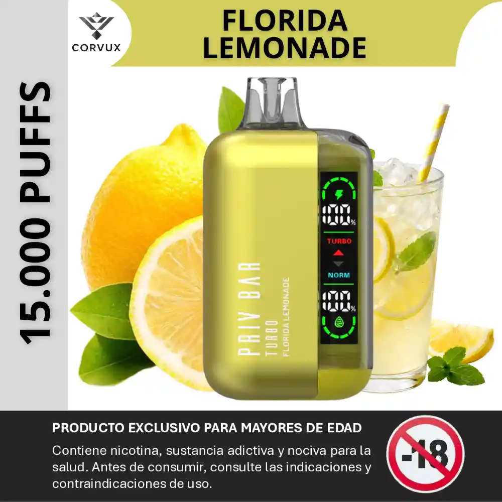 PROHIBIDA LA VENTA A MENORES DE EDAD. PRODUCTO EXCLUSIVO PARA MAYORES DE EDAD, CONTIENE NICOTINA, SUSTANCIA ADICTIVA Y NOCIVA PARA LA SALUD. ANTES DE CONSUMIR, CONSULTE LAS INDICACIONES Y CONTRAINDICACIONES DE USO. El Priv Bar Turbo 15000 Puffs es un dispositivo desechable recargable de la marca SMOK con hasta ~15 000 inhalaciones en modo normal y ~10 000 en modo Turbo. Está precargado con 16 ml de e-líquido y utiliza nicotina al 5 % (50 mg), cuenta con batería recargable de 800 mAh, pantalla LED para nivel de batería y líquido y flujo de aire ajustable para personalizar la experiencia. El sabor Florida Lemonade busca evocar una mezcla de limón fresco y dulce estilo limonada, equilibrando notas cítricas brillantes con toques dulces más suaves para un perfil refrescante. ✨ Perfil del sabor ✦ Notas Principales: Cítricos de limón con acidez clara y un toque dulce que recuerda a limonada casera. ✦ Contrastes: El ácido del limón se equilibra con un dulzor ligero, ofreciendo un sabor vivo sin ser abrumador. ✦ Experiencia Sensorial: Perfil brillante y refrescante con sensación cítrica nítida, generando una impresión ligera y vivaz en cada inhalación. ✦ Ideal para: Personas que prefieren sabores cítricos claros, refrescantes y equilibrados con un toque de dulzor. 📋 Especificaciones técnicas ✦ E-líquido precargado: 16 ml ✦ Concentración de sales de nicotina: 5 % (50 mg) ✦ Puffs aproximados: hasta 15 000 (modo estándar) y 10 000 en modo Turbo ✦ Batería recargable: 800 mAh con puerto USB-C ✦ Pantalla LED para nivel de batería y e-líquido ✦ Flujo de aire ajustable para personalizar la calada PROHIBIDA LA VENTA A MENORES DE EDAD. PRODUCTO EXCLUSIVO PARA MAYORES DE EDAD, CONTIENE NICOTINA, SUSTANCIA ADICTIVA Y NOCIVA PARA LA SALUD. ANTES DE CONSUMIR, CONSULTE LAS INDICACIONES Y CONTRAINDICACIONES DE USO.