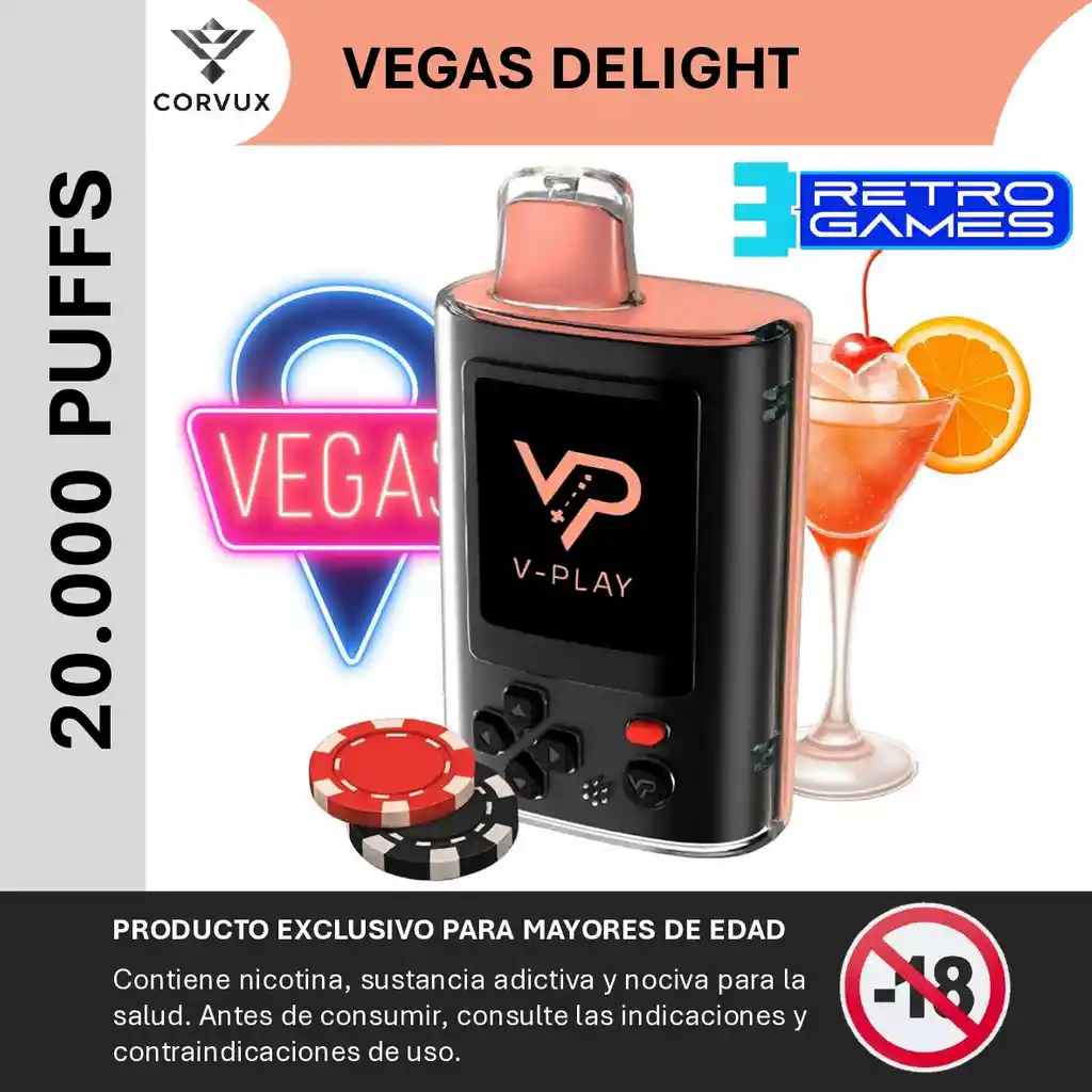 PROHIBIDA LA VENTA A MENORES DE EDAD. PRODUCTO EXCLUSIVO PARA MAYORES DE EDAD, CONTIENE NICOTINA, SUSTANCIA ADICTIVA Y NOCIVA PARA LA SALUD. ANTES DE CONSUMIR, CONSULTE LAS INDICACIONES Y CONTRAINDICACIONES DE USO. Vape Vplay - Vegas Delight Incluye 3 juegos Retro Pantalla: LED de 1.77 pulgadas Nicotina: 5% Capacidad de e-líquido: 25ml Capacidad de la batería: 850mAh Puffs: 20,000 Puerto de carga USB Tipo-C