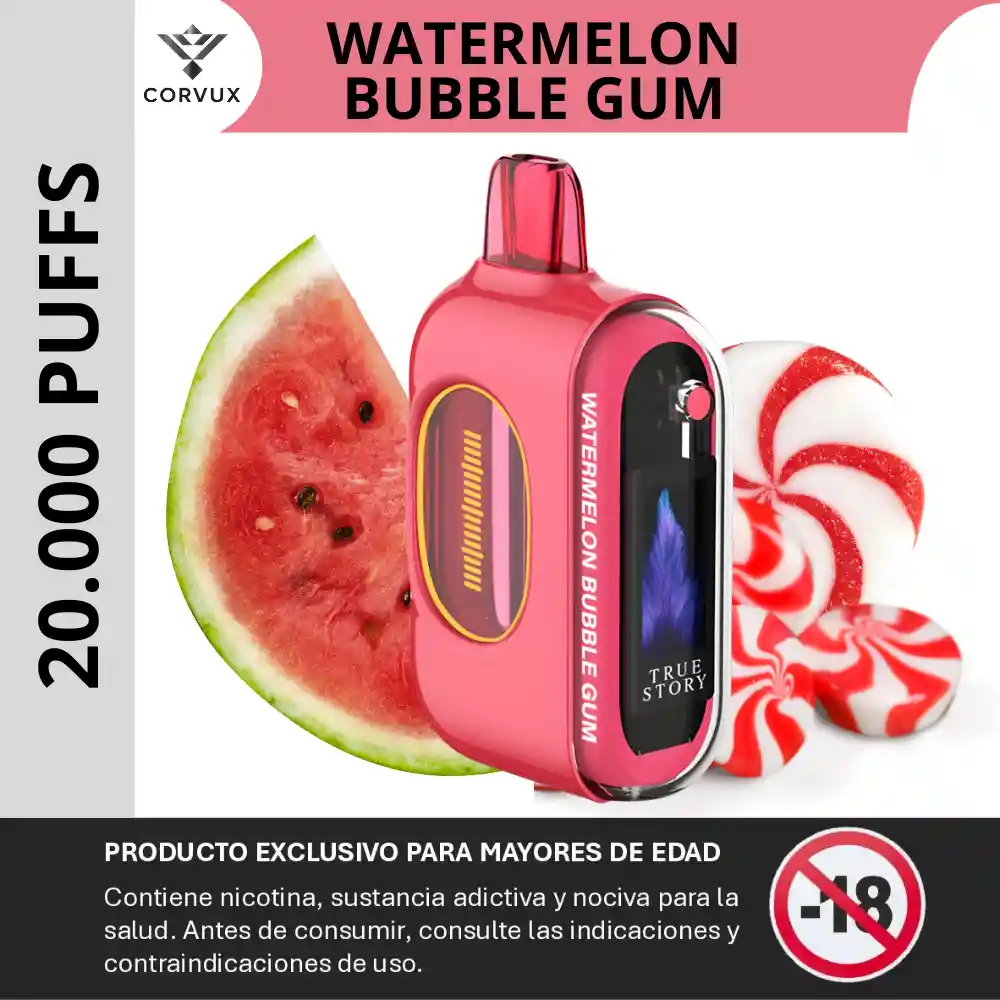 PROHIBIDA LA VENTA A MENORES DE EDAD. PRODUCTO EXCLUSIVO PARA MAYORES DE EDAD, CONTIENE NICOTINA, SUSTANCIA ADICTIVA Y NOCIVA PARA LA SALUD. ANTES DE CONSUMIR, CONSULTE LAS INDICACIONES Y CONTRAINDICACIONES DE USO. Dispositivo electrónico de vapeo recargable con capacidad aproximada de 20 000 puffs. Cuenta con pantalla digital, batería recargable mediante puerto USB Tipo-C y flujo de aire ajustable. El sabor Watermelon Bubble Gum combina esencias frutales de sandía con un perfil dulce tipo goma de mascar. ✨ Perfil del sabor Notas principales: Predomina el aroma dulce de sandía, acompañado de matices tipo caramelo o chicle frutal. Contrastes: Contiene un nivel bajo a medio de frescura, que aporta equilibrio frente al dulzor característico del aroma principal. Experiencia sensorial: Durante la inhalación se perciben notas frutales dulces en la exhalación se conserva una sensación fresca leve con retrogusto azucarado. Ideal para: Consumidores adultos que prefieren perfiles dulces con base frutal, inspirados en mezclas tipo confitería, con frescura moderada y sin predominio mentolado. 📋 Especificaciones técnicas ✦ Capacidad de e-líquido: 20 mL (pre-llenado) ✦ Nivel de nicotina: 5 % (≈ 50 mg/mL) — nicotina tipo sal ✦ Puffs estimados: Hasta 20 000 puffs (aprox., según modo y flujo de aire) ✦ Batería: 700 mAh 🔋 — recargable vía USB Tipo-C ⚡ ✦ Pantalla / Interfaz: Indicador LED de nivel de batería y e-líquido ✦ Resistencia (coil): Malla (mesh coil) para vaporización uniforme ✦ Activación: Automática por succión (draw-activated) ✦ Flujo de aire: Ajustable mediante control integrado ✦ Modos de potencia: Normal / Boost, según preferencia de intensidad PROHIBIDA LA VENTA A MENORES DE EDAD. PRODUCTO EXCLUSIVO PARA MAYORES DE EDAD, CONTIENE NICOTINA, SUSTANCIA ADICTIVA Y NOCIVA PARA LA SALUD. ANTES DE CONSUMIR, CONSULTE LAS INDICACIONES Y CONTRAINDICACIONES DE USO.