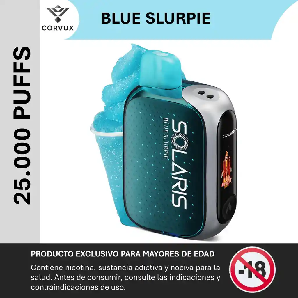 PROHIBIDA LA VENTA A MENORES DE EDAD. PRODUCTO EXCLUSIVO PARA MAYORES DE EDAD, CONTIENE NICOTINA, SUSTANCIA ADICTIVA Y NOCIVA PARA LA SALUD. ANTES DE CONSUMIR, CONSULTE LAS INDICACIONES Y CONTRAINDICACIONES DE USO. Vape Solaris - Blue Slurpie - Carga solar y tipo C. - 25,000 puffs. - Batería recargable de 700 mAh. - Nicotina al 5%. - Pantalla HD. - Modos Normal y Boost. - Ajuste de flujo de aire.