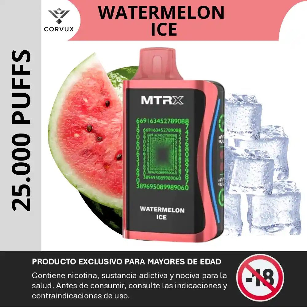 PROHIBIDA LA VENTA A MENORES DE EDAD. PRODUCTO EXCLUSIVO PARA MAYORES DE EDAD, CONTIENE NICOTINA, SUSTANCIA ADICTIVA Y NOCIVA PARA LA SALUD. ANTES DE CONSUMIR, CONSULTE LAS INDICACIONES Y CONTRAINDICACIONES DE USO. El MTRX MX 25000 Puffs - Watermelon Ice, combina la jugosidad dulce de la sandía con un toque refrescante mentolado, resultando en un perfil frutal dulce-fresco con sensación limpia en cada calada. ✦ Notas principales: Predomina el sabor a sandía dulce y jugosa, con un perfil frutal original y vibrante. ✦ Contrastes: La dulzura natural de la sandía se combina con un frescoro tipo “ice”/mentolado, aportando limpieza al perfil sin que el sabor resulte empalagoso. ✦ Experiencia sensorial: Al inhalar, el vapor tiene una densidad media-alta, facilitando una sensación frutal inicial marcada por la sandía. El golpe en garganta es medio, típico de un dispositivo con 5 % de nicotina (50 mg/ml). Durante la exhalación, el efecto “ice” emerge gradualmente, dejando una sensación fresca y un retrogusto limpio, equilibrando el dulzor con frescura. La tecnología de quad mesh coil y la configuración de flujo de aire ayudan a mantener la consistencia del sabor durante todas las caladas. ✦ Ideal para: Personas que prefieren un perfil frutal dulce con frescor mentolado, con una sensación refrescante y jugosa, en un dispositivo de desempeño prolongado. ⚙️ Especificaciones técnicas: ✦ Caladas estimadas: ~25 000 puffs ✦ E-líquido prellenado: 20 ml ✦ Batería: Recargable 900 mAh (USB-C) ✦ Resistencia: Quad mesh coil (malla cuádruple), con cambio automático de dual coils cada ~10 segundos ✦ Flujo de aire: Ajustable ✦ Nicotina: 5 % (50 mg/ml), según ficha estándar del modelo. PROHIBIDA LA VENTA A MENORES DE EDAD. PRODUCTO EXCLUSIVO PARA MAYORES DE EDAD, CONTIENE NICOTINA, SUSTANCIA ADICTIVA Y NOCIVA PARA LA SALUD. ANTES DE CONSUMIR, CONSULTE LAS INDICACIONES Y CONTRAINDICACIONES DE USO.