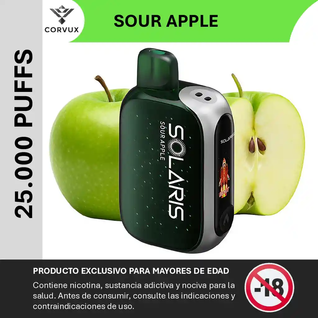 PROHIBIDA LA VENTA A MENORES DE EDAD. PRODUCTO EXCLUSIVO PARA MAYORES DE EDAD, CONTIENE NICOTINA, SUSTANCIA ADICTIVA Y NOCIVA PARA LA SALUD. ANTES DE CONSUMIR, CONSULTE LAS INDICACIONES Y CONTRAINDICACIONES DE USO. Vape Solaris - Sour Apple - Carga solar y tipo C. - 25,000 puffs. - Batería recargable de 700 mAh. - Nicotina al 5%. - Pantalla HD. - Modos Normal y Boost. - Ajuste de flujo de aire.