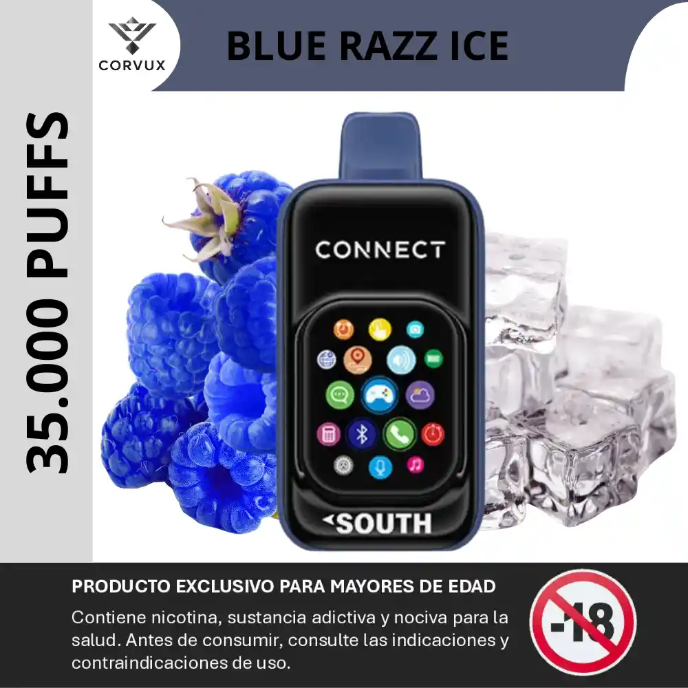 PROHIBIDA LA VENTA A MENORES DE EDAD. PRODUCTO EXCLUSIVO PARA MAYORES DE EDAD, CONTIENE NICOTINA, SUSTANCIA ADICTIVA Y NOCIVA PARA LA SALUD. ANTES DE CONSUMIR, CONSULTE LAS INDICACIONES Y CONTRAINDICACIONES DE USO. El South Connect 35 000 Puffs - Blue Razz Ice, combina un perfil frutal inspirado en frambuesa azul (blue raspberry) con un toque fresco tipo “ice”/mentol, para entregar una mezcla equilibrada entre dulzor frutal y sensación refrescante. ✦ Notas principales: Blue Razz (frambuesa azul): sabor frutal con matices dulces y ligeros toques ácidos. Ice / Mentol: aporta una sensación fría que complementa el perfil frutal sin dominarlo. ✦ Contrastes: La combinación de fruta dulce y frescor mentolado busca un equilibrio donde el sabor frutal se mantiene claro, y la sensación fría añade limpieza al paladar sin resultar agresiva. ✦ Experiencia sensorial: Al inhalar: se percibe el sabor frutal de frambuesa azul con un vapor de densidad media. Golpe en garganta: medio, acorde con la concentración habitual de nicotina salina al 5 % (50 mg), típica del modelo. Al exhalar: emerge la sensación “ice”, dejando un retrogusto frutal-refrescante y limpio. La pantalla táctil y la conectividad Bluetooth permiten controlar funciones del dispositivo y personalizar la experiencia. ✦ Ideal para: Personas que prefieren un perfil frutal dulce con frescura moderada, combinando sabores de bayas y un toque frío. ⚙️ Especificaciones técnicas: ✦ Caladas estimadas: ~35 000 puffs. ✦ E-líquido prellenado: 18 ml. ✦ Batería: 900 mAh recargable (USB-C). ✦ Pantalla: 2″ pantalla táctil. ✦ Conectividad: Bluetooth + funciones de app/juegos/altavoz. ✦ Resistencia: Dual Mesh Coil. ✦ Nicotine: 5 % (50 mg) sales de nicotina. PROHIBIDA LA VENTA A MENORES DE EDAD. PRODUCTO EXCLUSIVO PARA MAYORES DE EDAD, CONTIENE NICOTINA, SUSTANCIA ADICTIVA Y NOCIVA PARA LA SALUD. ANTES DE CONSUMIR, CONSULTE LAS INDICACIONES Y CONTRAINDICACIONES DE USO.