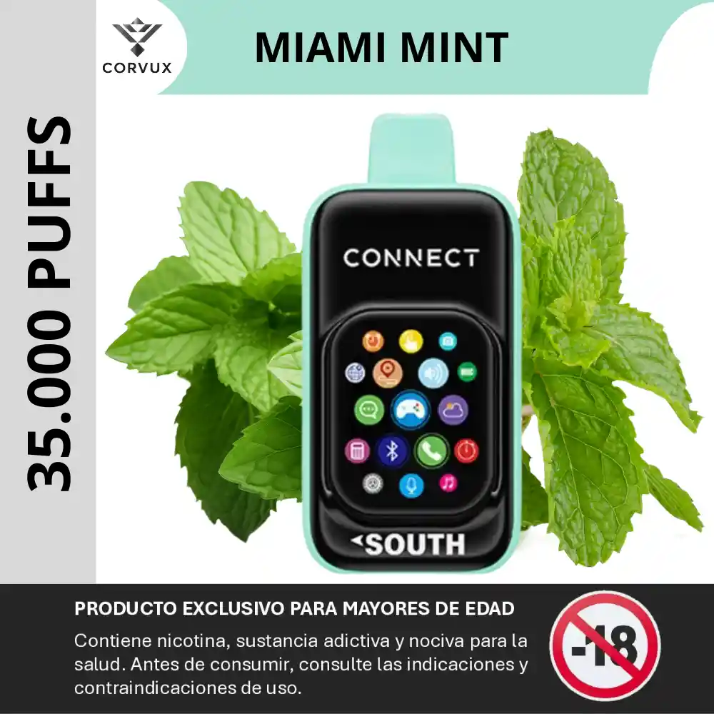 PROHIBIDA LA VENTA A MENORES DE EDAD. PRODUCTO EXCLUSIVO PARA MAYORES DE EDAD, CONTIENE NICOTINA, SUSTANCIA ADICTIVA Y NOCIVA PARA LA SALUD. ANTES DE CONSUMIR, CONSULTE LAS INDICACIONES Y CONTRAINDICACIONES DE USO. El South Connect 35 000 Puffs - Miami Mint, tiene un perfil de sabor que se centra en una menta fresca y limpia, con un carácter refrescante claro y sin componentes frutales añadidos. ✦ Notas principales: Menta: sabor fresco, herbal y definido. Frescura tipo mentol: aporta una sensación fría uniforme sin resultar agresiva. ✦ Contrastes: El perfil se mantiene sobrio y directo, sin dulzor frutal ni notas cremosas. La menta y el efecto fresco se equilibran para evitar saturación o aspereza. ✦ Experiencia sensorial: Al inhalar: se percibe inmediatamente la menta, con vapor de densidad media-alta. Golpe en garganta: medio, acorde con las versiones estándar del dispositivo que utilizan sales de nicotina en concentraciones habituales del mercado. Al exhalar: la frescura mentolada se mantiene, dejando un retrogusto frío y limpio, sin dulzor residual. La resistencia dual mesh favorece una entrega de sabor estable durante el uso prolongado. ✦ Ideal para: Usuarios que prefieren un perfil refrescante y mentolado, sin mezclas frutales ni sabores dulces, en un dispositivo de larga duración. ⚙️ Especificaciones técnicas: ✦ Caladas estimadas: ~35 000 puffs. ✦ E-líquido prellenado: 18 ml. ✦ Batería: 900 mAh recargable (USB-C). ✦ Pantalla: 2″ pantalla táctil. ✦ Conectividad: Bluetooth + funciones de app/juegos/altavoz. ✦ Resistencia: Dual Mesh Coil. ✦ Nicotine: 5 % (50 mg) sales de nicotina. PROHIBIDA LA VENTA A MENORES DE EDAD. PRODUCTO EXCLUSIVO PARA MAYORES DE EDAD, CONTIENE NICOTINA, SUSTANCIA ADICTIVA Y NOCIVA PARA LA SALUD. ANTES DE CONSUMIR, CONSULTE LAS INDICACIONES Y CONTRAINDICACIONES DE USO.