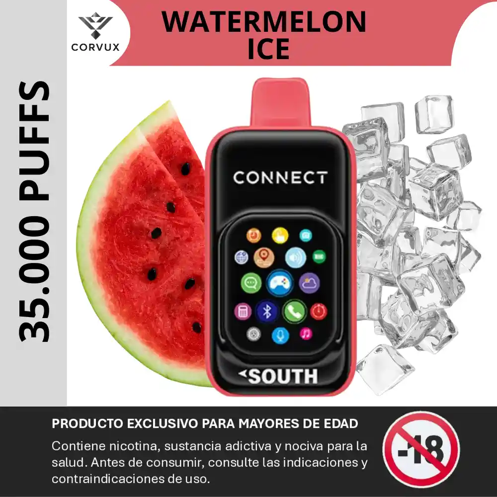 PROHIBIDA LA VENTA A MENORES DE EDAD. PRODUCTO EXCLUSIVO PARA MAYORES DE EDAD, CONTIENE NICOTINA, SUSTANCIA ADICTIVA Y NOCIVA PARA LA SALUD. ANTES DE CONSUMIR, CONSULTE LAS INDICACIONES Y CONTRAINDICACIONES DE USO. El South Connect 35 000 Puffs - Watermelon Ice, combina el sabor de sandía dulce y jugosa con un toque frío tipo mentolado, dando como resultado un perfil frutal con frescura moderada. ✦ Notas principales: Sandía: sabor frutal dulce y jugoso, con sensación natural y limpia. Ice / Mentol: frescura fría moderada que complementa la sandía sin resultar aguda. ✦ Contrastes: La dulzura de la sandía se equilibra con el efecto frío, ofreciendo un perfil frutal-refrescante sin notas mentoladas intensas ni acidez excesiva. No presenta notas cremosas ni sabores ajenos al perfil predominantemente frutal. ✦ Experiencia sensorial: Al inhalar: se percibe inicialmente la sandía, con vapor de densidad media-alta. Golpe en garganta: medio, consistente con dispositivos que utilizan sales de nicotina en concentraciones habituales del mercado. Al exhalar: la sensación fría se hace más evidente, dejando un retrogusto frutal-refrescante y limpio. La pantalla táctil y la configuración técnica favorecen una entrega uniforme de sabor durante la vida útil del dispositivo. ✦ Ideal para: Usuarios que prefieren un perfil frutal refrescante, centrado en sandía con toque frío, sin que la frescura opaque las notas frutales. ⚙️ Especificaciones técnicas: ✦ Caladas estimadas: ~35 000 puffs. ✦ E-líquido prellenado: 18 ml. ✦ Batería: 900 mAh recargable (USB-C). ✦ Pantalla: 2″ pantalla táctil. ✦ Conectividad: Bluetooth + funciones de app/juegos/altavoz. ✦ Resistencia: Dual Mesh Coil. ✦ Nicotine: 5 % (50 mg) sales de nicotina. PROHIBIDA LA VENTA A MENORES DE EDAD. PRODUCTO EXCLUSIVO PARA MAYORES DE EDAD, CONTIENE NICOTINA, SUSTANCIA ADICTIVA Y NOCIVA PARA LA SALUD. ANTES DE CONSUMIR, CONSULTE LAS INDICACIONES Y CONTRAINDICACIONES DE USO.