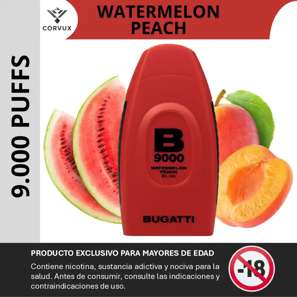 PROHIBIDA LA VENTA A MENORES DE EDAD. PRODUCTO EXCLUSIVO PARA MAYORES DE EDAD, CONTIENE NICOTINA, SUSTANCIA ADICTIVA Y NOCIVA PARA LA SALUD. ANTES DE CONSUMIR, CONSULTE LAS INDICACIONES Y CONTRAINDICACIONES DE USO. El Bugatti 9000 Puffs Watermelon Peach, su perfil de sabor combina sandía dulce y jugosa con durazno suave y aromático, dando lugar a una mezcla frutal equilibrada y ligera. ✦ Notas principales: Sandía: sabor dulce y acuoso, con sensación fresca y ligera. Durazno: nota frutal suave, con carácter aromático y redondeado. ✦ Contrastes: El dulzor ligero de la sandía se equilibra con la suavidad del durazno, creando un perfil frutal balanceado, sin acidez marcada ni sensación empalagosa. No presenta notas mentoladas ni efectos “ice”. ✦ Experiencia sensorial: Al inhalar: se percibe primero la sandía, con un sabor frutal limpio y vapor de densidad media.Golpe en garganta: medio, acorde con las versiones estándar del dispositivo que utilizan sales de nicotina en concentraciones habituales del mercado.Al exhalar: el durazno aparece de forma más clara, dejando un retrogusto frutal suave, sin dulzor excesivo.La pantalla LED permite controlar el estado del dispositivo, favoreciendo una experiencia más predecible durante su uso. ✦ Ideal para: Usuarios que buscan un perfil frutal suave y equilibrado, con combinación de frutas dulces sin notas frías ni sabores intensos. ⚙️ Especificaciones técnicas: ✦ Caladas estimadas: ~9000 puffs. ✦ E-líquido prellenado: ~15 ml. ✦ Batería: Recargable USB-C (~600–650 mAh). ✦ Nicotine strength: 5 %. ✦ Pantalla: LED integrada para batería y e-líquido. ✦ Activación: Por inhalación (draw-activated). PROHIBIDA LA VENTA A MENORES DE EDAD. PRODUCTO EXCLUSIVO PARA MAYORES DE EDAD, CONTIENE NICOTINA, SUSTANCIA ADICTIVA Y NOCIVA PARA LA SALUD. ANTES DE CONSUMIR, CONSULTE LAS INDICACIONES Y CONTRAINDICACIONES DE USO.