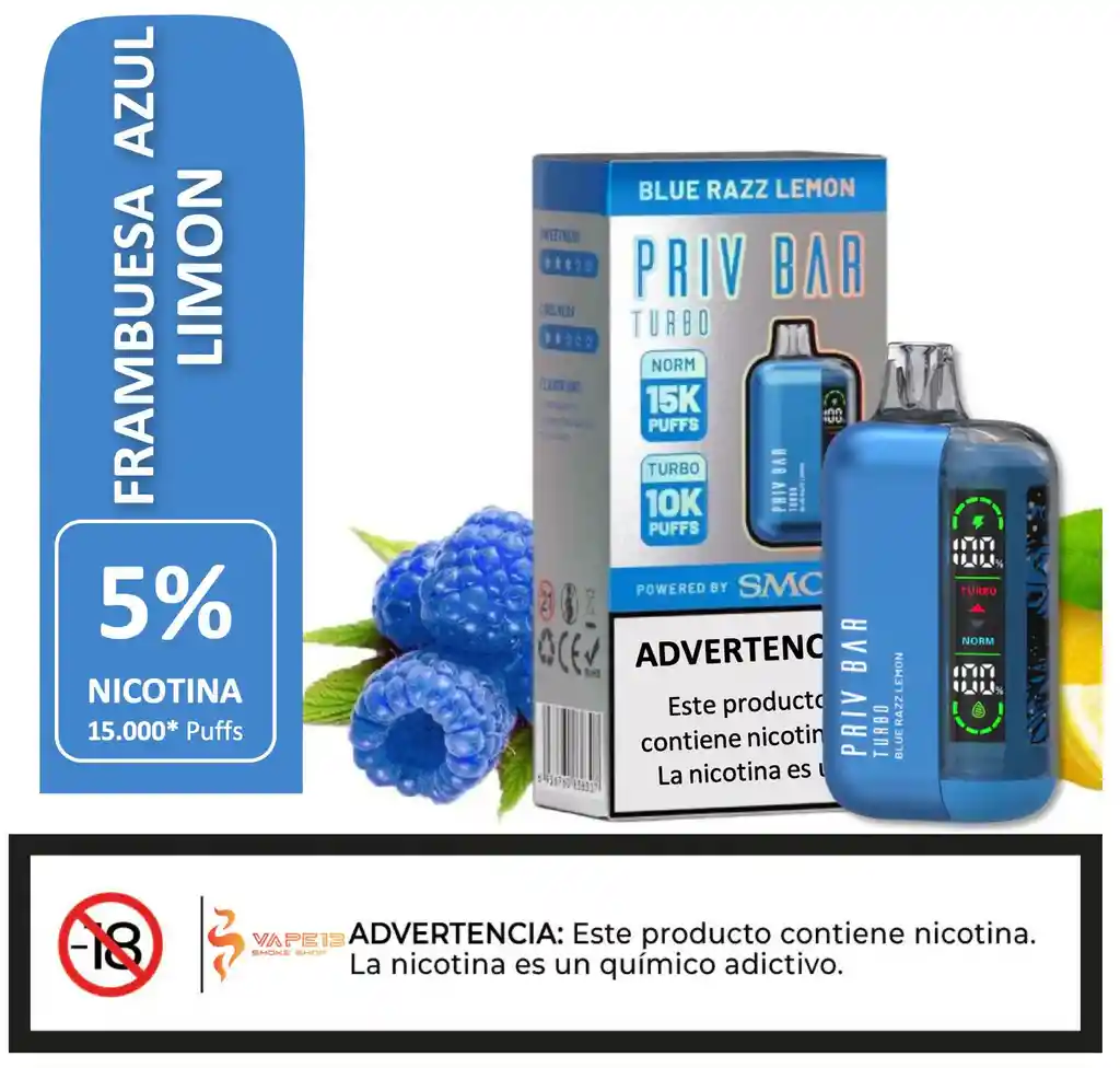 PB15BRL Priv Bar Turbo 15000 Blue Razz Lemon V-a-p-e desechable es un dispositivo extraordinario equipado con 16ml de e-liquid precargado y una batería recargable. Está equipado con una pantalla que convenientemente Pantalla de visualización que muestra tanto el estado de la batería como el nivel de e-juice. Diseñado para ofrecer aproximadamente 15,000 usos