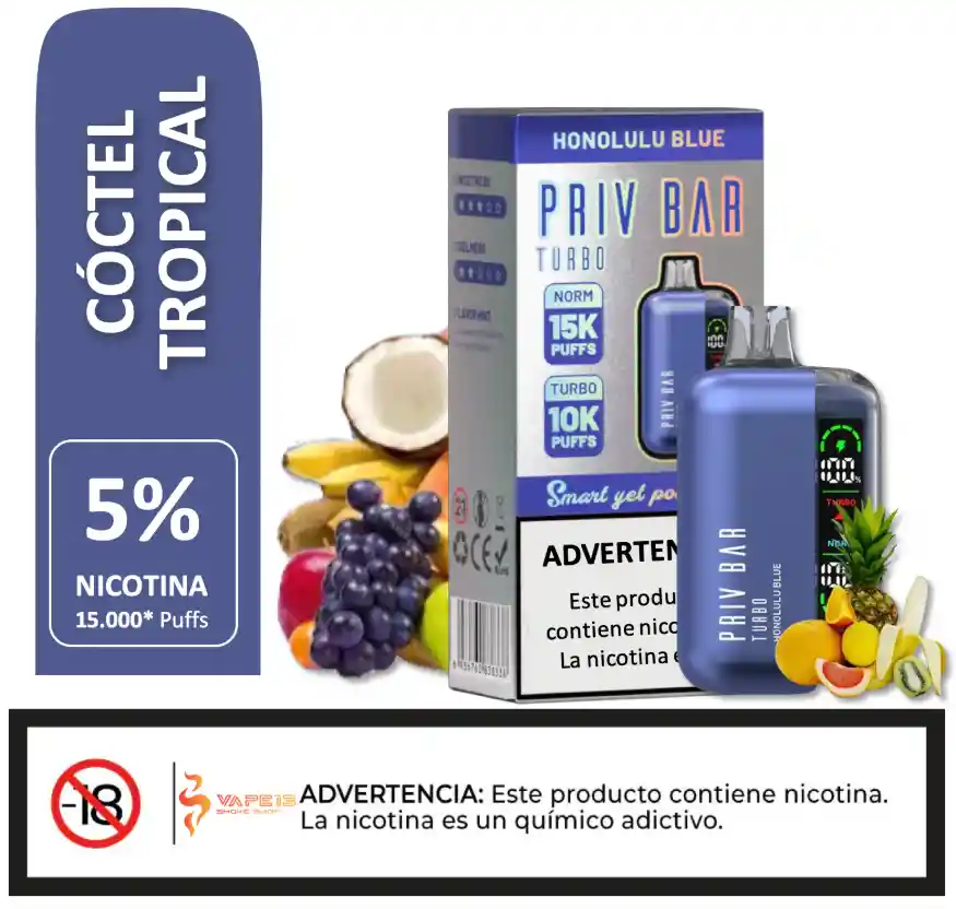 PB15HB Priv Bar Turbo 15000 Honolulu Blue V-a-p-e desechable es un dispositivo extraordinario equipado con 16ml de e-liquid precargado y una batería recargable. Está equipado con una pantalla que convenientemente Pantalla de visualización que muestra tanto el estado de la batería como el nivel de e-juice. Diseñado para ofrecer aproximadamente 15,000 usos