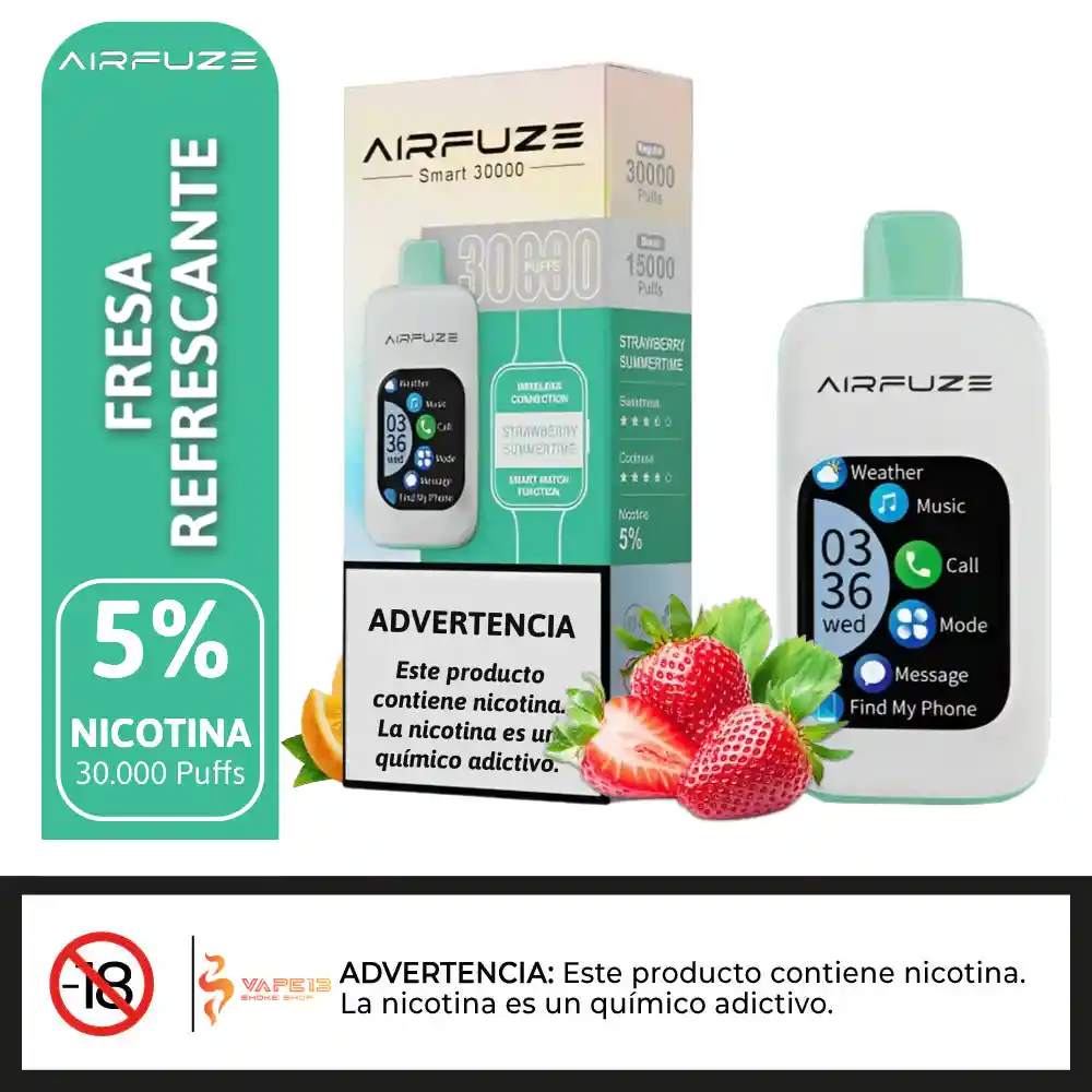 Airfuze Smart 30K – STRAWBERRY SUMMERTIME - Tecnología y Sabor en un Solo Dispositivo ⚡ V-a-p-e-a como nunca con el Airfuze Smart 30K, el desechable inteligente de 30,000 usos que combina potencia, conectividad y sabores premium. 🚀 Lo que lo hace único: 🔥Pantalla táctil TFT de 2.01”: Control total de tu experiencia con un solo toque. 🔥Conexión Bluetooth: Escucha música, responde llamadas, toma fotos y más. 🔥Modos de potencia ajustables: Elige entre Suave (12W), Normal (18W) o Boost (25W). 🔥Sabores frutales intensos: Mezclas dulces y refrescantes para cada gusto. 🔥Autonomía increíble: Hasta 30,000 usos en modo regular o 15,000 en modo Boost.