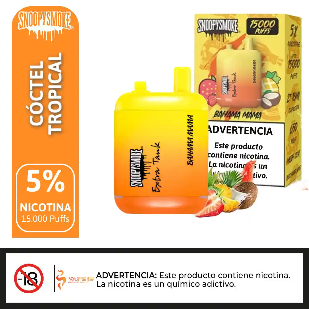 Echa un vistazo al Snoopy Smoke - BAHAMA MAMA - Extra Tank 2 Desechable, que ofrece 18mL x 2 de capacidad precargada, 5% de potencia de n-i-c-@-t--i-n-a, y ofrece hasta 15000 usos. Sn@opy-Sm@ke Extra Tank 2 15000 Desechable Características: – Capacidad precargada: 18mL x 2 – Capacidad de la batería: 650mAh – Max Usos: 15000 – Potencia de nicotina: 5% (50mg) – Funcionamiento: Activado por tiro – Elemento calefactor: Bobina de malla – Carga: Puerto Tipo-C.