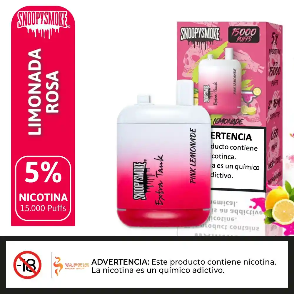 Echa un vistazo al Snoopy Smoke - PINK LEMONADE - Extra Tank 2 Desechable, que ofrece 18mL x 2 de capacidad precargada, 5% de potencia de n-i-c-@-t--i-n-a, y ofrece hasta 15000 usos. Sn@opy-Sm@ke Extra Tank 2 15000 Desechable Características: – Capacidad precargada: 18mL x 2 – Capacidad de la batería: 650mAh – Max Usos: 15000 – Potencia de nicotina: 5% (50mg) – Funcionamiento: Activado por tiro – Elemento calefactor: Bobina de malla – Carga: Puerto Tipo-C.
