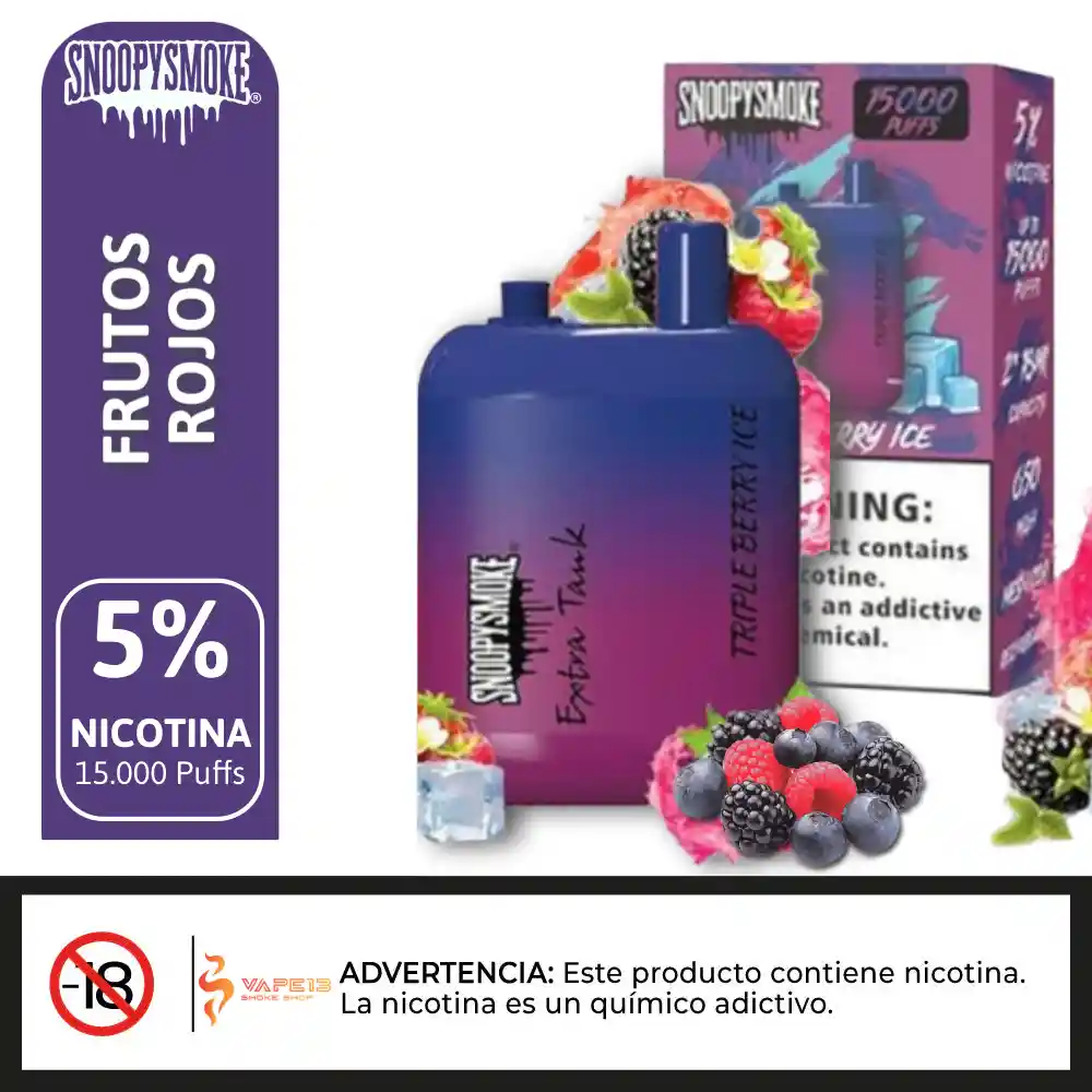 Echa un vistazo al Snoopy Smoke - TRIPLE BERRY ICE - Extra Tank 2 Desechable, que ofrece 18mL x 2 de capacidad precargada, 5% de potencia de n-i-c-@-t--i-n-a, y ofrece hasta 15000 usos. Sn@opy-Sm@ke Extra Tank 2 15000 Desechable Características: – Capacidad precargada: 18mL x 2 – Capacidad de la batería: 650mAh – Max Usos: 15000 – Potencia de nicotina: 5% (50mg) – Funcionamiento: Activado por tiro – Elemento calefactor: Bobina de malla – Carga: Puerto Tipo-C.