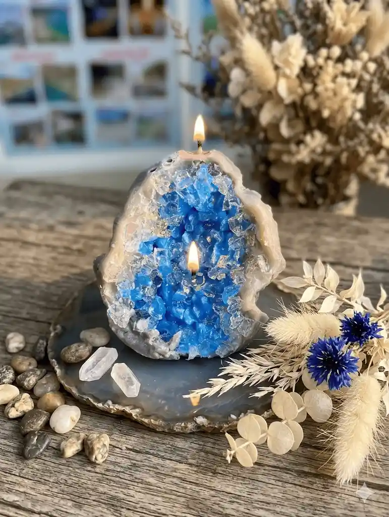Vela aromática tipo cuarzo azul. Energiza tu hogar y llénalo de aromas florales. O simplemente disfruta de esta vela como un adorno en tu hogar