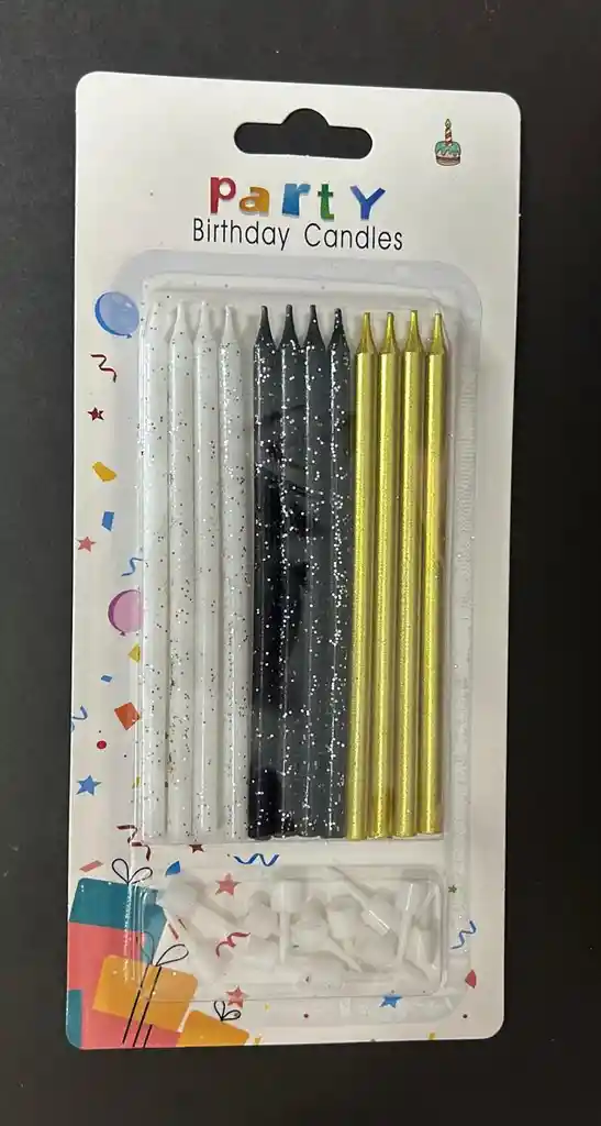 Vela Cumpleaños Larga Escarchada X12 Dorada / Negra / Blanca