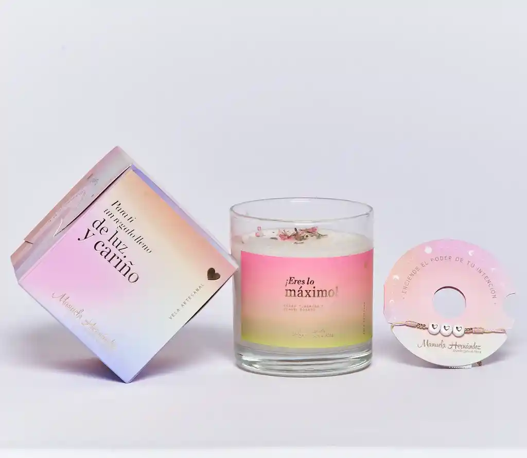 Vela elaborada con aceite de soya, cedro, tuberosa y clavel rosado.