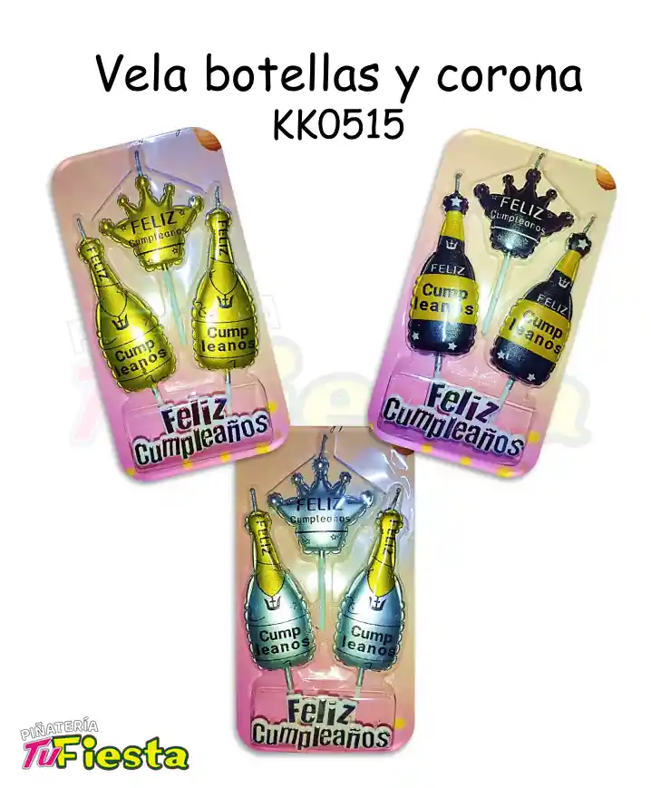 VELA FELIZ CUMPLEAÑOS BOTELLAS Y CORONA KK0515 Colores: Doradp, plata, negro Nota: Nos escribes por favor cual color deseas