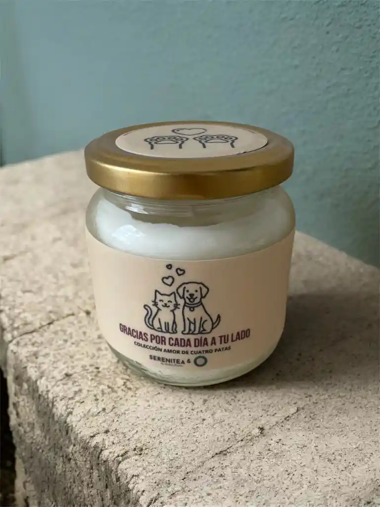 Vela aromática artesanal, con la intención de acompañarte a agradecer por la vida y compañía de tu peludo. Hecha en Colombia, peso neto 375 gr.