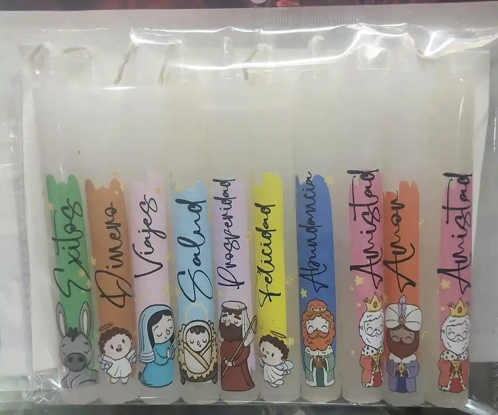 velas blancas decoradas, con pedidos de fe, paquete X 10 und.