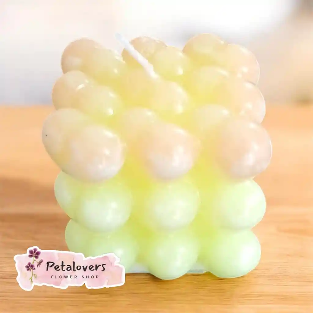 Elegante vela en forma de cubo con diseño de bolitas en cera . Un detalle moderno y sofisticado que aporta cal...Ver más