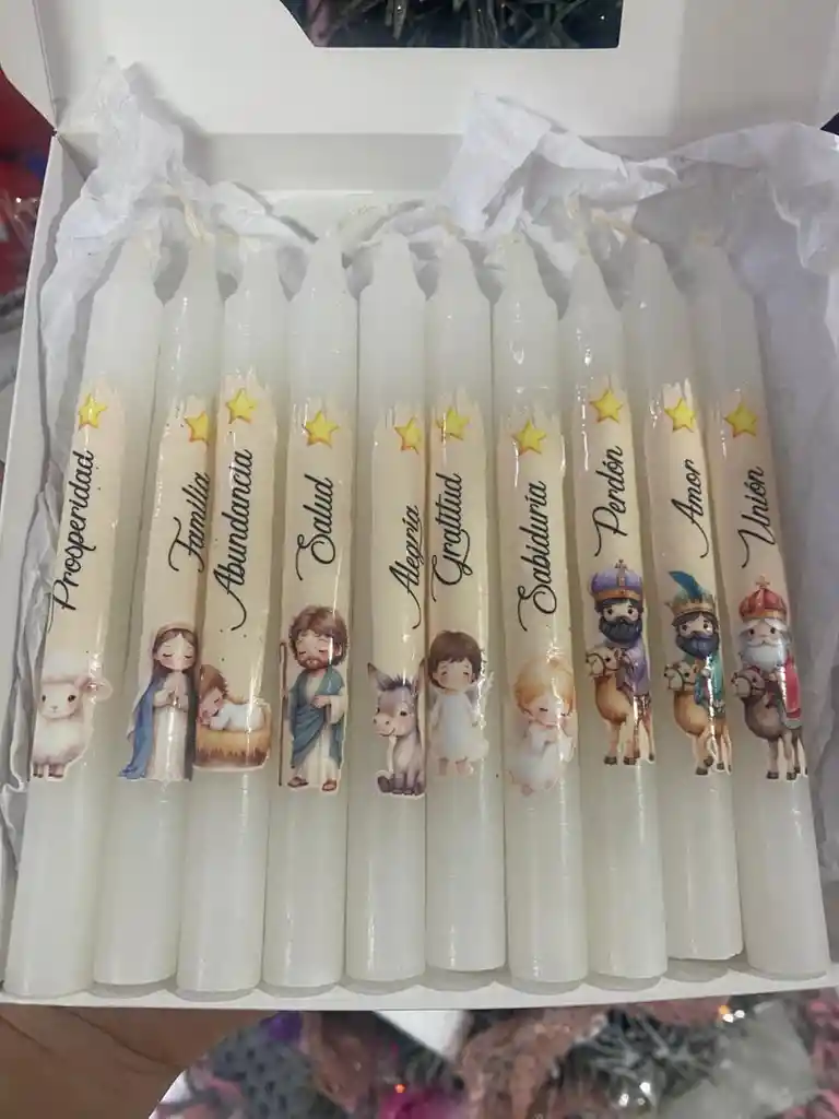 Caja x10 und de velas blancas de Pesebre con deseos