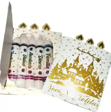 velas, decoradas, palabras de fe, caja X 7 und. tamaño 14,5 largo X 2.
