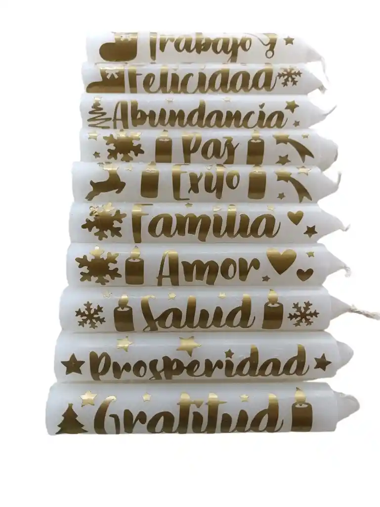 Paquete de velas X10 con Deseos para alumbrar tu noche de Velitas este 7 de Diciembre. Referencia: Vela blanca con mensajes en dorado. Empaque: Bolsa celofán. Medidas: 13 CM de alto x2cm diametro