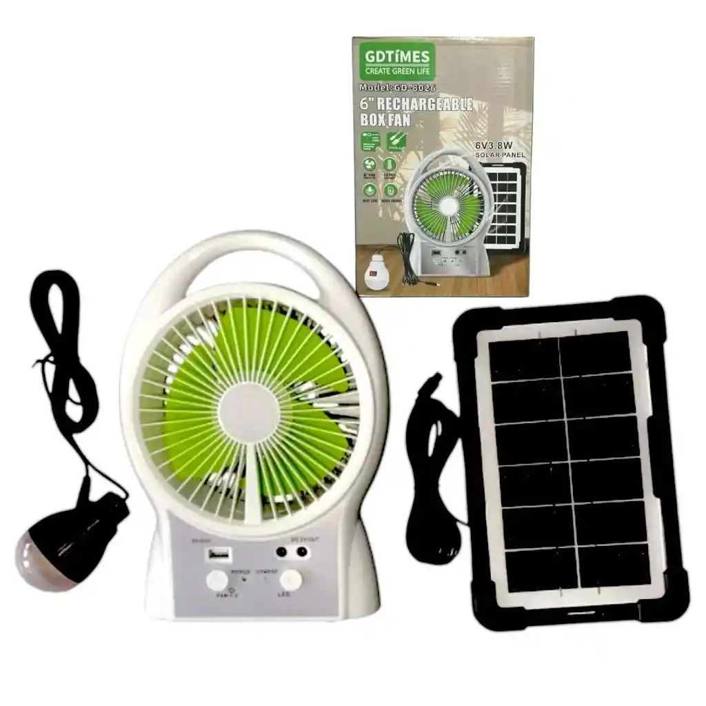 Ventilador Solar con Parlante GD8026 Descripción: Este innovador ventilador combina la funcionalidad de un ventilador portátil y un sistema de audio, ideal para disfrutar de un ambiente fresco mientras escucha su música favorita. Características: - Fuente de energía solar: Operado por panel solar, lo que lo hace ecológico y eficiente. - Parlante integrado: Ofrece calidad de sonido superior para disfrutar de su música. - Diseño portátil: Ligero y fácil de transportar, perfecto para el uso en exteriores. - Batería recargable: Garantiza un rendimiento duradero incluso en condiciones de poca luz solar.