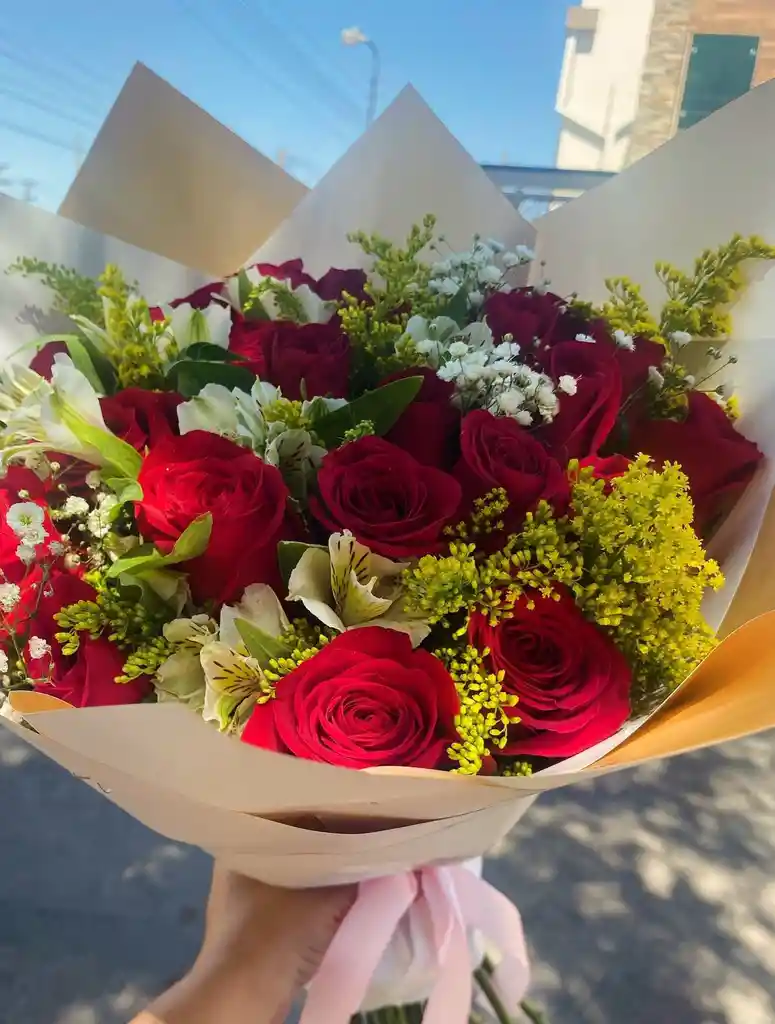 Ramo de rosas rojas mas astromelias, relleno y papel coreano