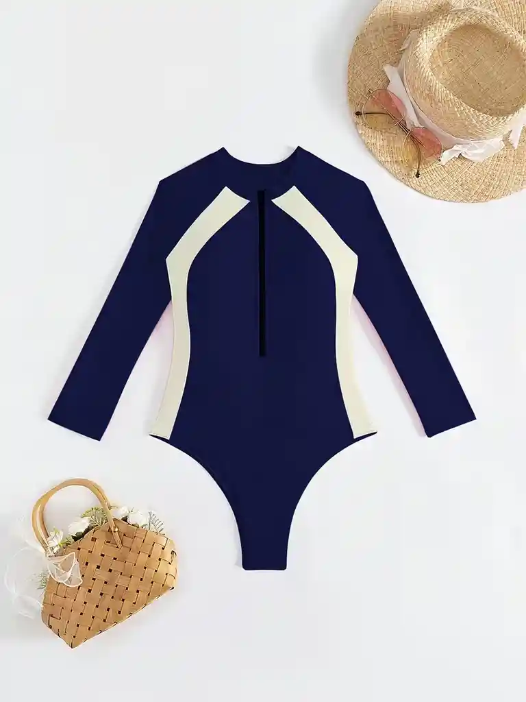 Traje de Baño de Mujer de Manga Larga con Cremallera y Bloque de Color, Semi-Competencia. Detalles del producto. Detalles: Cremallera Estampado: Colores contrastantes Escarpado: No Tela: Elasticidad alta Estilo de cuello: Cuello redondo Tipo: Una pieza Instrucciones de cuidado: Lavar a máquina, no lavar en seco Estilo: Deportivo Material: Nailon Tipo de impresión: Sin estampado Composición: 80% Nailon, 20% Elastano Método de tejido: Tela tejida