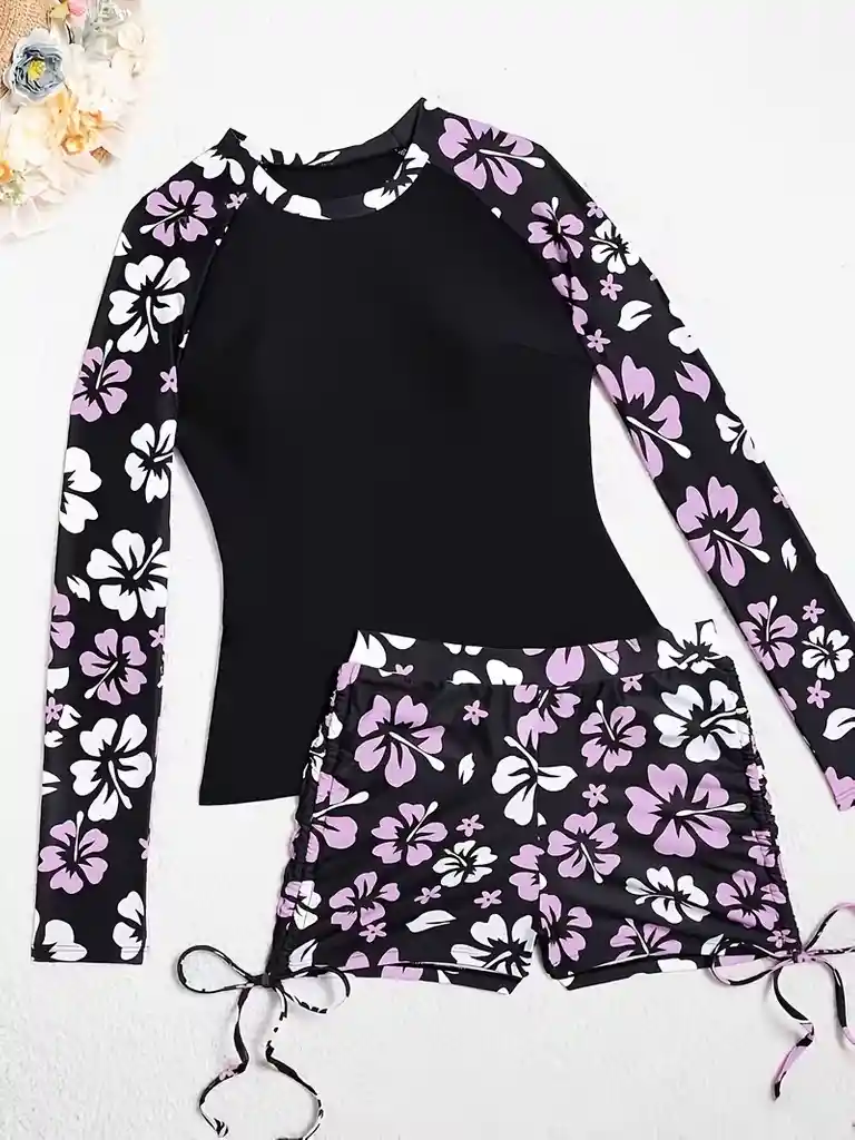 2pcs Elegante Tankini de Manga Larga con Shorts - Trajes de Baño Modestos de Cobertura Completa, Almohadillas de Pecho Extraíbles y Shorts de Tabla para Surf/Descanso, Conjuntos de Baño para Vacaciones de Verano. Detalles del producto. Almohadilla para el pecho: Relleno removible Tipo de prenda inferior: Bermudas Detalles: Cordón Estampado: Floral Escarpado: No Tela: Elasticidad media Estilo de cuello: Cuello redondo Tipo: Conjuntos Instrucciones de cuidado: Lavable a máquina, no en seco. Estilo: Elegante Otro material: Elastano Material: Nailon Tipo de impresión: Estampado aleatorio Composición: 82% Nailon, 18% Elastano Método de tejido: Tela tejida Ingredientes del revestimiento: 95% Poliéster, 5% Elastano