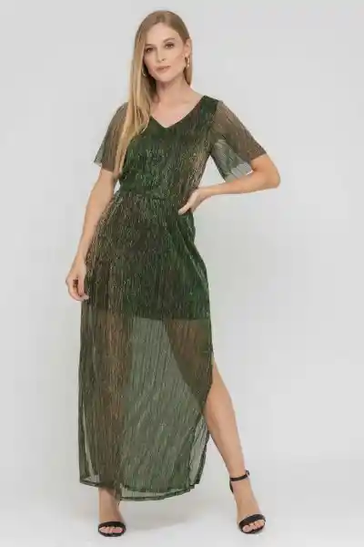 Tejido de Punto Brillo Lurex Forrado Escote en V Manga Corta Campaña Larga Con Aberturas Laterales.