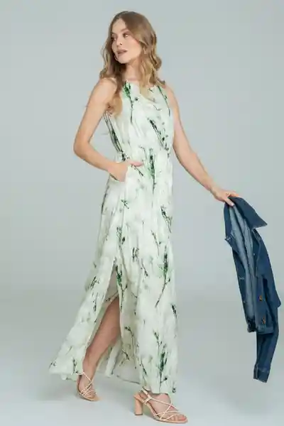 Largo en Chalis Estampado Escote Redondo Manga Sisa Perilla Con Botón Metálico Elástico de 1 cm en Cintura Bolsillos en Los Laterales de la Abertura en Frente Forrado Silueta Semi Ajustada.