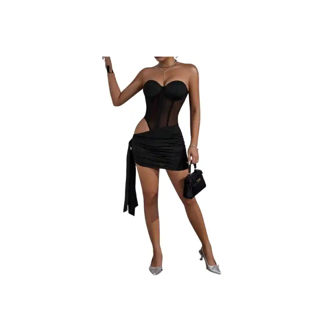 Vestido Negro Corto con Corset – Estilo Sexy & Elegante Impacta con este espectacular vestido negro corto que combina la sensualidad del corset con un diseño moderno y atrevido. Su parte superior tipo corset incluye varillas estructuradas y transparencias laterales, dando una figura más definida y estilizada. La falda asimétrica con corte lateral descubierto y amarre drapeado crea un efecto único que realza las curvas y aporta un toque de glamour. Confeccionado en tela suave y ajustada, es perfecto para una noche especial, fiestas, eventos o salidas donde quieras robar miradas. Un vestido que mezcla elegancia, actitud y sensualidad en una sola prenda. Talla S