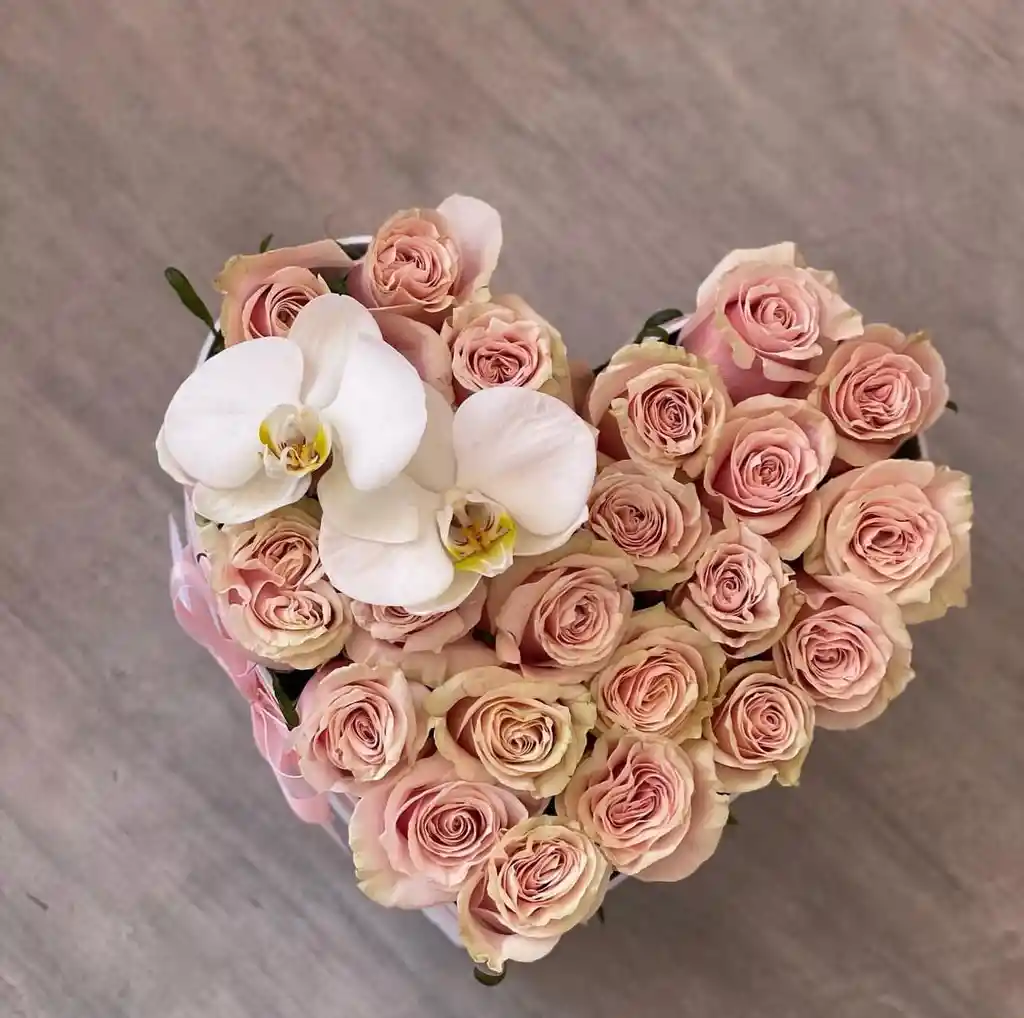 Una creación floral de lujo que exalta la elegancia en su máxima expresión. Un diseño que transmite pureza, amor y distinción, convirtiendo cada detalle en una experiencia memorable para ocasiones únicas. DESCRIPCIÓN Una fusión delicada entre la suavidad romántica de las rosas y la sofisticación atemporal de las orquídeas, dispuestas en perfecta armonía dentro de una caja en forma de corazón. INCLUYE - Tarjeta personalizada sin costo adicional.