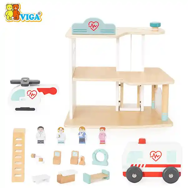 De Madera de 3 Niveles Con Ambulancia Camillas Ascensor y Figuras de Médicos y Pacientes. Ideal Para Representar Situaciones de Cuidado Emergencias y Visitas al Doctor.