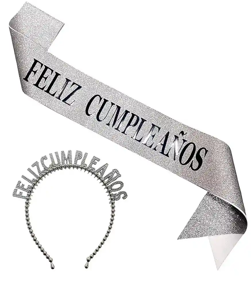 Vincha Diadema + Banda Feliz Cumpleaños Plateado