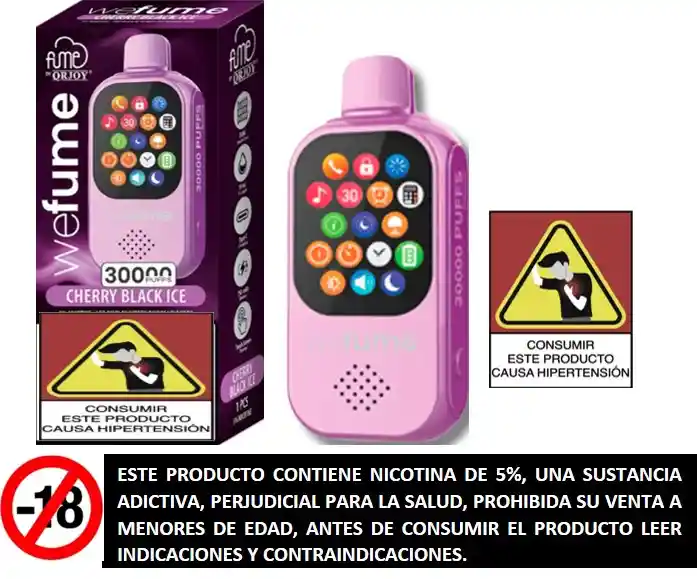 El WeFume 30K ofrece hasta 30000 inhalaciones con una capacidad de e-líquido precargado de 19 mL y una concentración de nicotina del 5%. Cuenta con conectividad Bluetooth, una pantalla táctil inteligente y funcionalidad de control por voz para una experiencia de vapeo de alta tecnología. Disponible en sabores como Black Ice, Miami Mint, Peach Banana y Strawberry Kiwi.