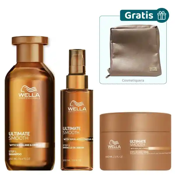 Kit Contiene 3 Unidades. Shampoo 250 mL + Mascarilla 150 mL + Sérum 30 mL + Cosmetiquera Gratis 1 Und. Con Nuestro Kit de Nutrición Ultimate Smooth Desintoxica y Nutre Profundamente el Cabello Por Dentro y Por Fuera Aportando Brillo y Suavidad. Compra Mascarilla y Serum y Recibe Gratis el Shampoo y Hermosa Cosmetiquera Ultimate Smooth. Incluye: Shampoo Nutrición Ultimate Smooth - Wella Professional: Formulado Con Tecnología Metal Purifier Para Desintoxicar el Cabello de Metales Además de Estar Enriquecido Con Escualano y Omega - 9 Para Nutrir Profundamente el Cabello Por Dentro y Fortalecer y Reponer la Barrera Protectora Exterior Del Mismo. Dermatológicamente Probado y Adecuado Para Cabello Tinturado. Mascarilla Nutrición Ultimate Smooth - Wella Professionals: Con Una Tecnología Patentada Enriquecida Con Escualano y Omega - 9 Para Nutrir el Cabello Por Dentro y Por Fuera. Tratamiento Capilar Para Cabello Encrespado Dañado y Sin Brillo. Mini Serum Nutrición Ultimate Smooth - Wella Professionals: Es un Aceite Capilar Delicado Que Nutre en Profundidad el Cabello Por Dentro y Por Fuera Dejándolo Visiblemente Más Suave y Brillante. Nutre el Cabello en 30 Segundos Aportándole Suavidad Que Dura Hasta 3 Días. Enriquecido Con Escualano y Omega - 9.